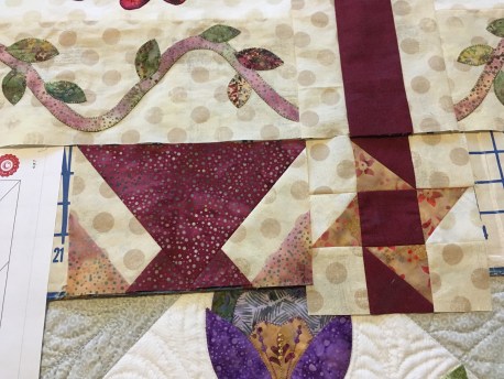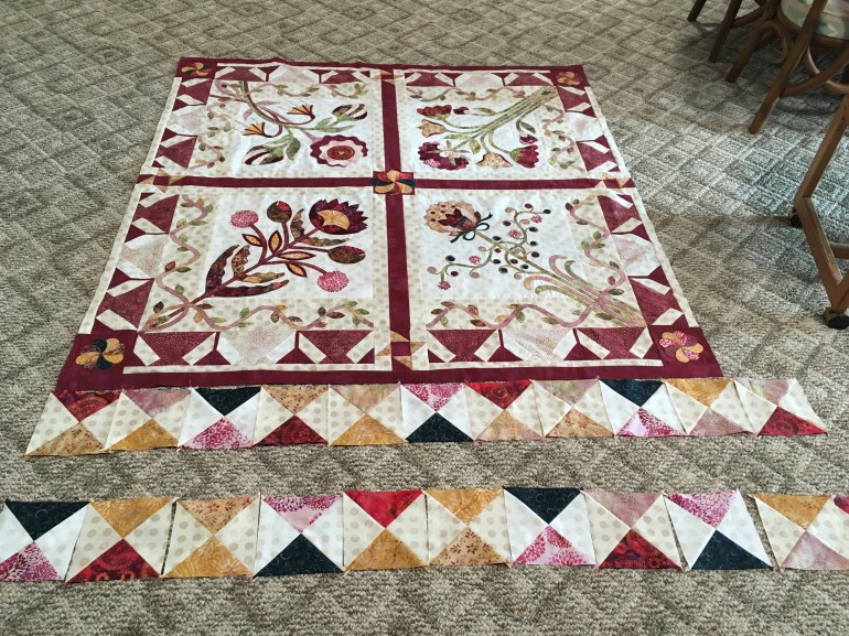 The top measured 60 x 60″ at this point. Because it is for my grand daughter’s twin bed, and plenty wide, I decided to add two borders to lengthen the quilt. I played with HSTs and utilized as much as of the batiks from my applique flowers as possible (a number of them were fat quarters or 1/4 yd so it was challenging!). I also brought in both background fabrics from the squares to make it a little scrappier.