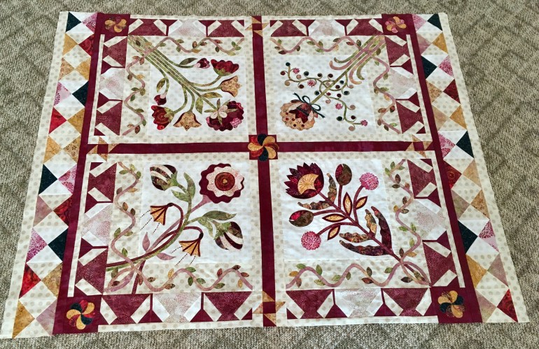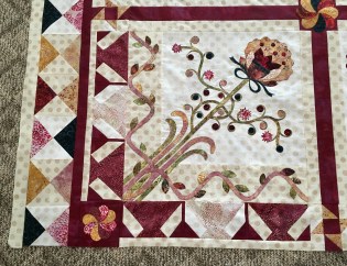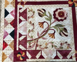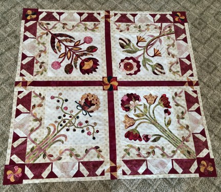 Wrapt in Love is another labor of love. But less sweaty and far less sticky! My center is complete, and the fiddley cornerstones and twirly center and border corners completed as reported earlier. But now for the baskets. I did a test basket and discovered that because I had made my center burgundy stripe slightly wider than the pattern (and made the cornerstones to that scale), the baskets are a bit off scale. After playing around with changing the scale of the basket, I decide to keep them as-is at 75%, which is the scale that I am working to, and simply add a bottom strip under the baskets to even the height of the border with the cornerstones. I like the look of it with the “shelf” under the baskets.