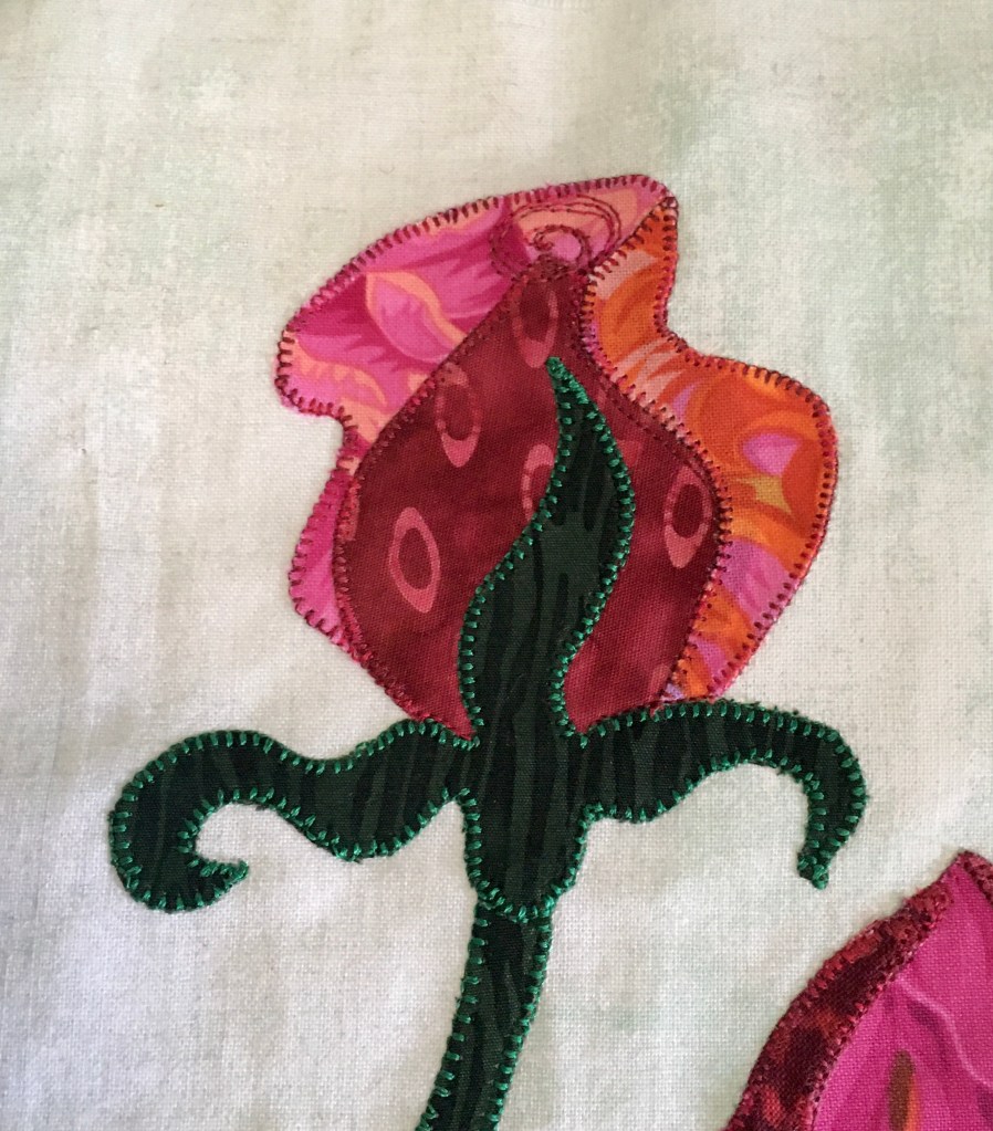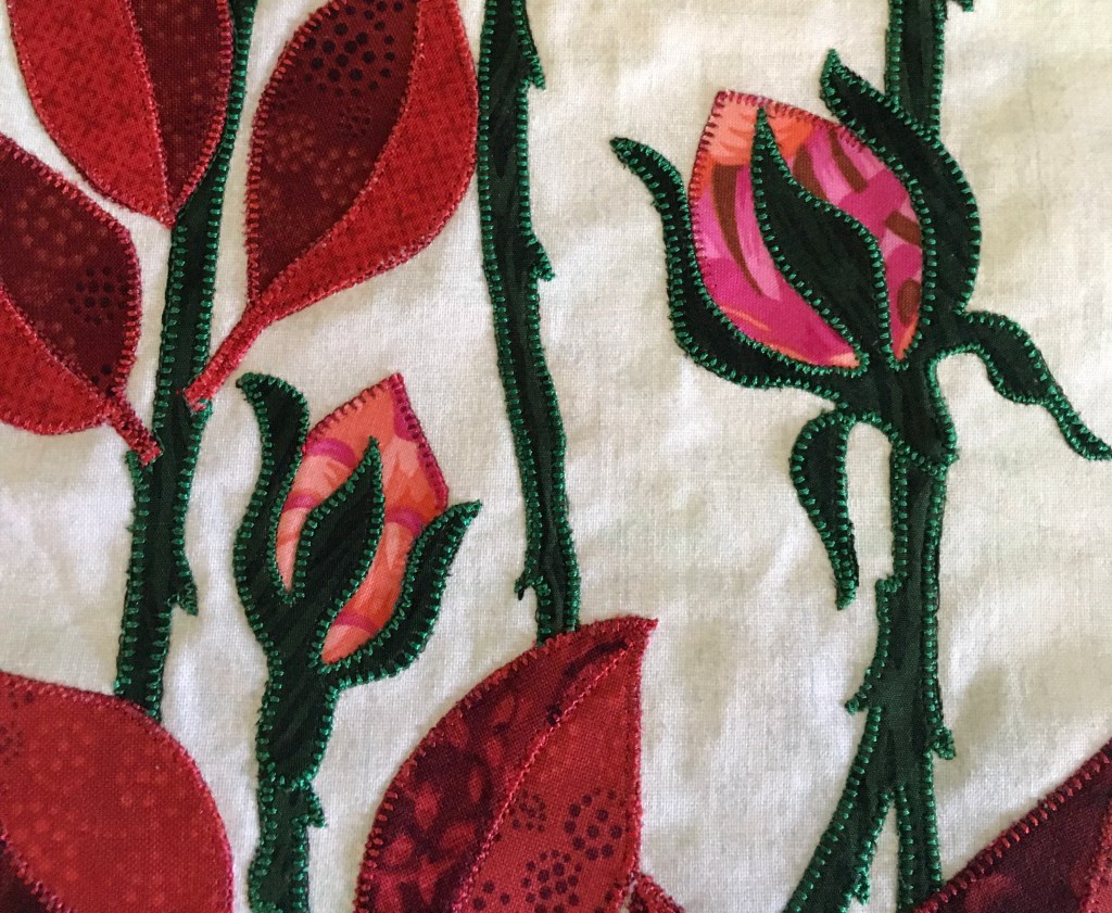 A couple of my Kaffe squares brightened up the rose buds and roses, which are rather fiddley being made up of small pieces. If I was making this again, I would make them all buds, but all in all I am happy with the block. There is a twirl at the center of two of the roses, which I FMQ’d on my Bernina rather than my large sit down machine. This block is rather labor intensive, due to the long, thin rose stems.