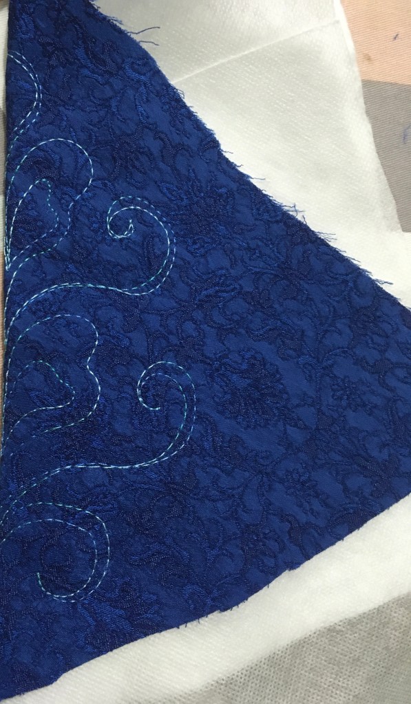 She chose a deep colbalt blue brocade synthetic knit for her jacket. Because this is a single color jacket, I am adding FMQ on the collar and pockets for interest and contrast. FMQ on the brocade knit proved to be a bit challenging. Using a thin batting alone with the lining produced puckery swirls. Adding interfacing with out the lining fabric also produced a puckering. But then my applique experience kicked in, and I added a water soluble stabilizer between the fabric and batting. Voila!