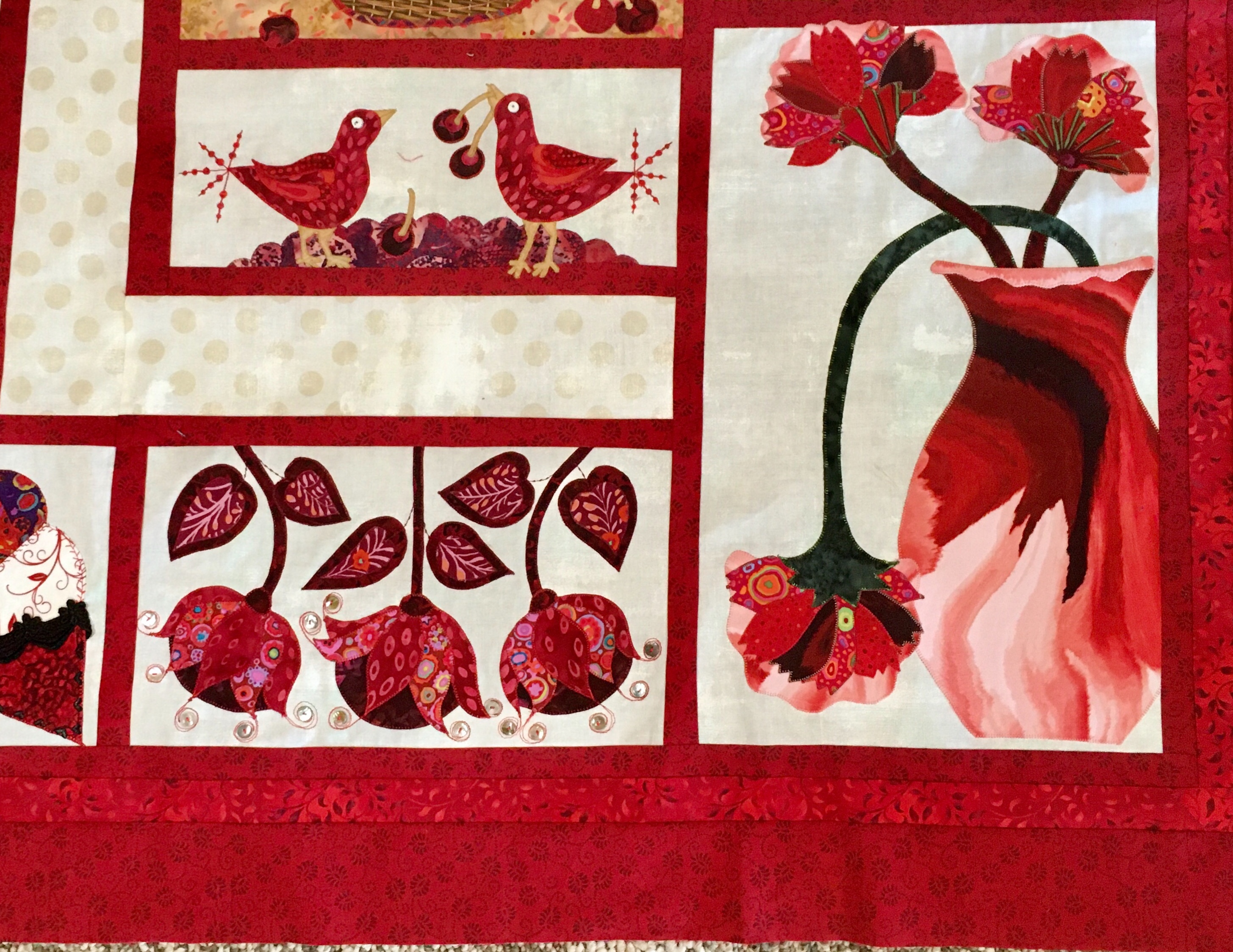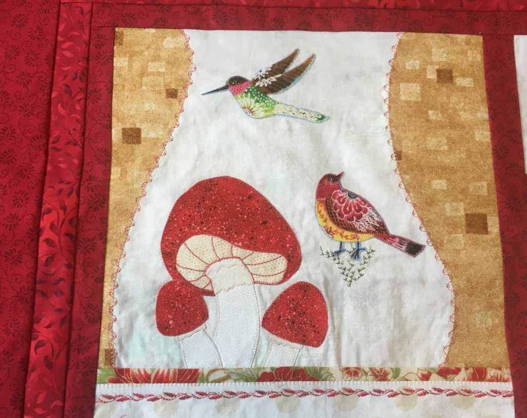 The birds were fussy cut and appliqued with MonoPoly. I also used a flange and deco stitching rather than an applique section at the join on this block.