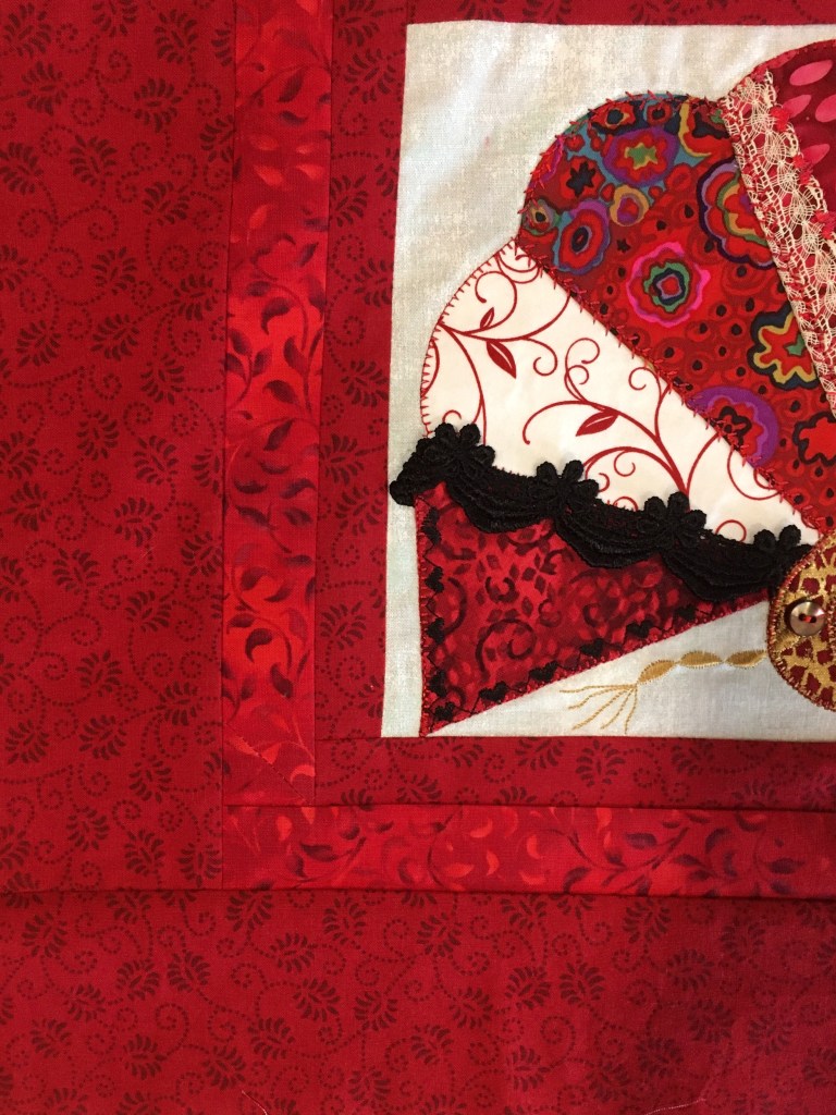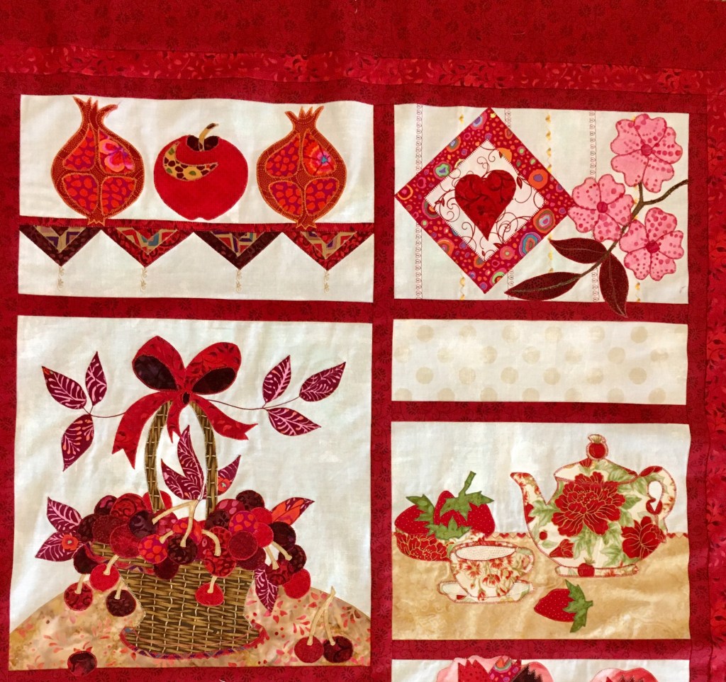 This pattern, Esther Aliu’s Red Delicious, is done at 80% size and is now 45″ x 47″. I did not reduce the sashing, which are 1.25″ as that seemed narrow enough. Any narrower, and sashing becomes tricky!