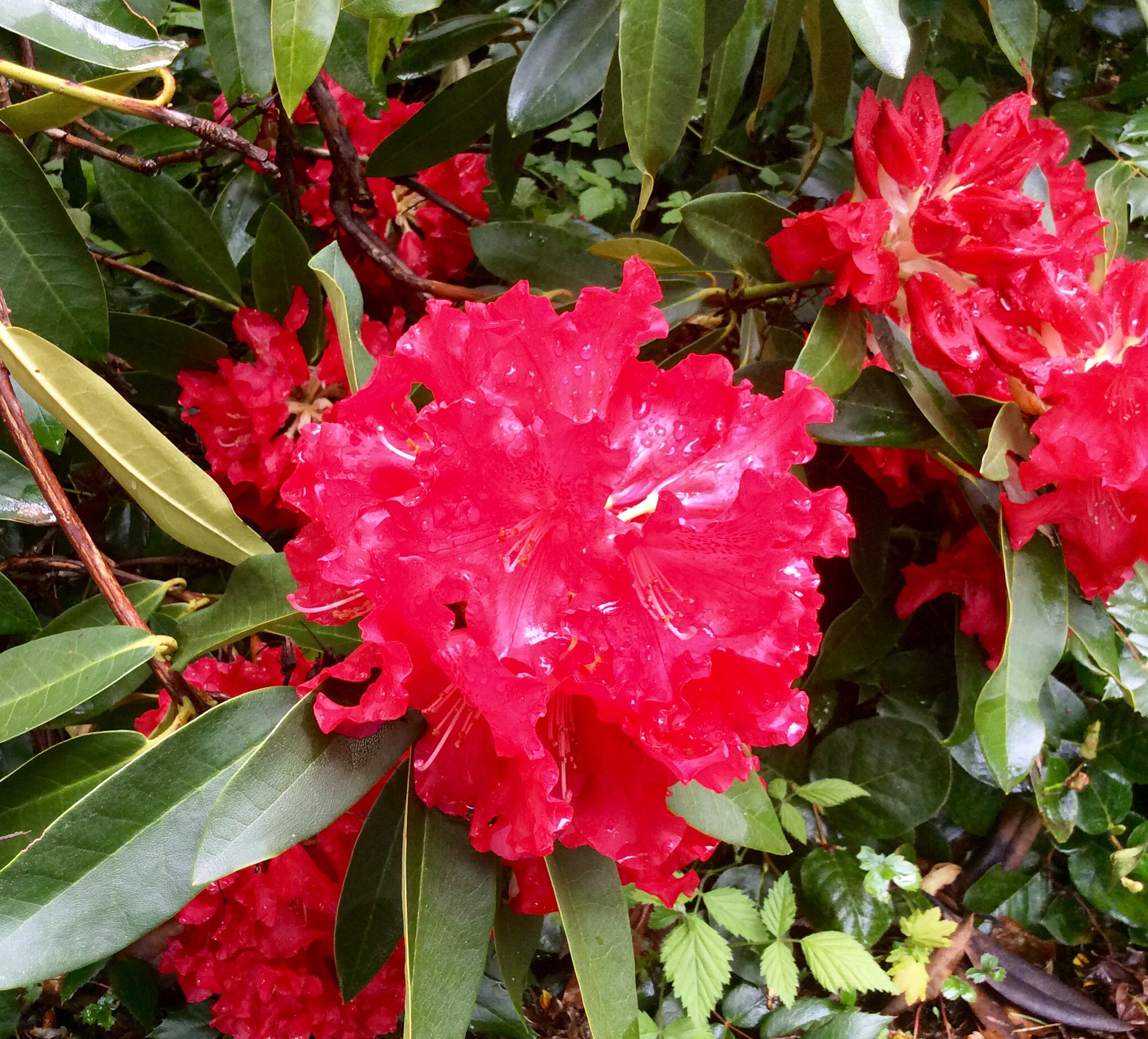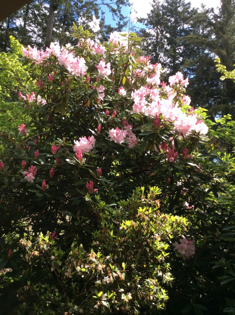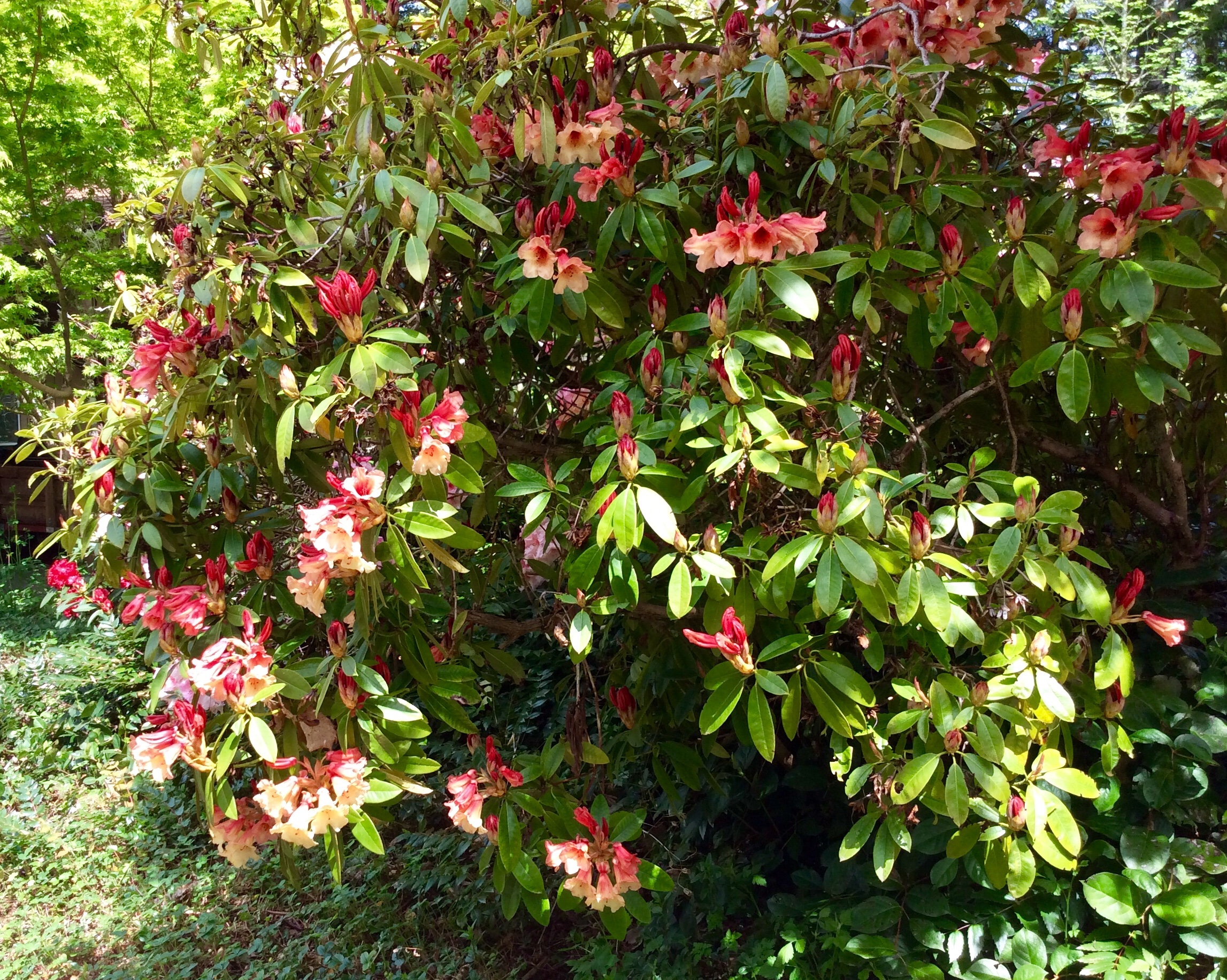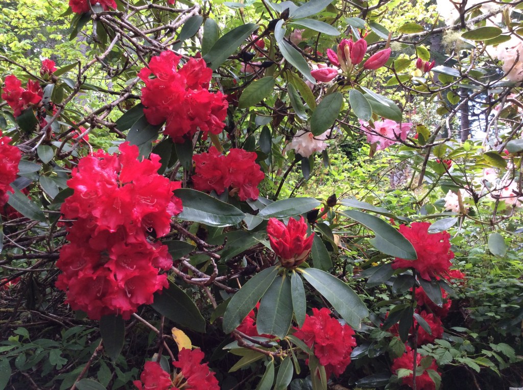 The Rhodies will be blooming for a while. They last quite a while and now that some are fading, there are later varieties starting their blooming.