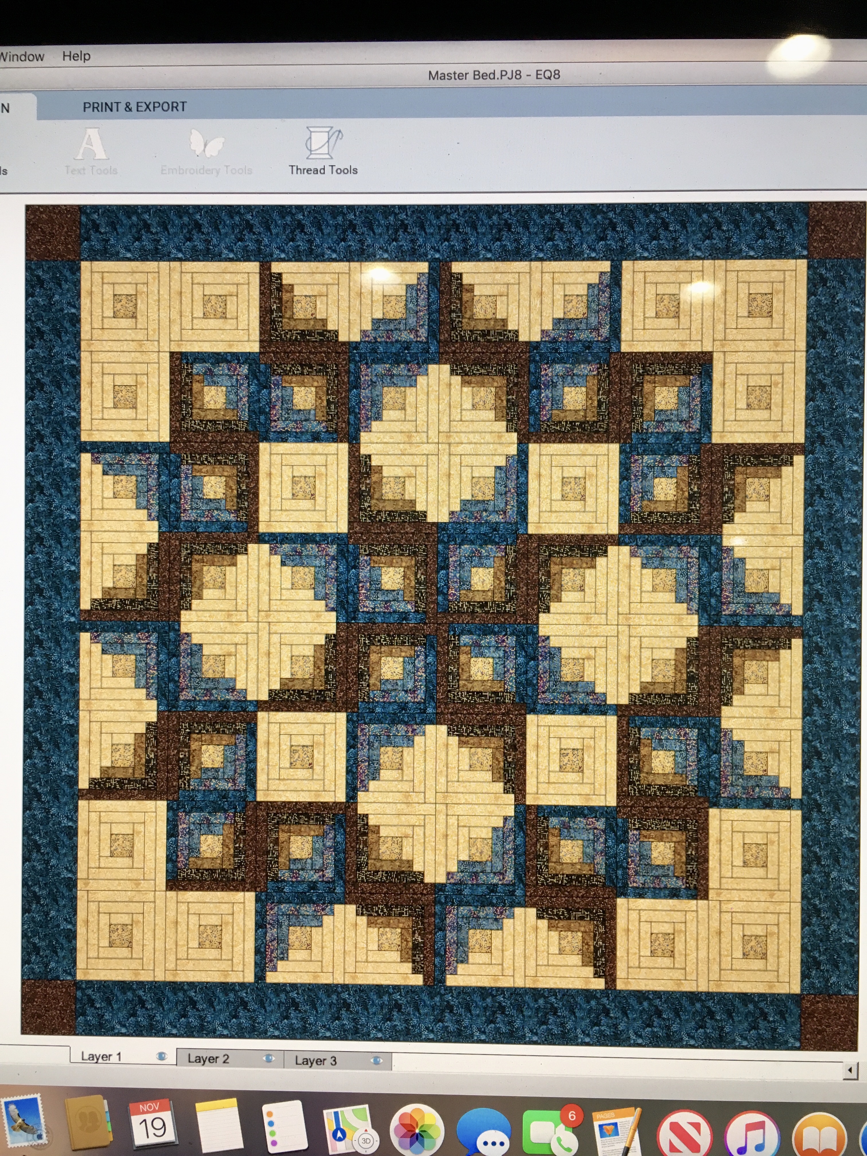 I also put this into my EQ8 Design software to test different fabrics, which was really helpful as my husband I negotiated fabric choices.
