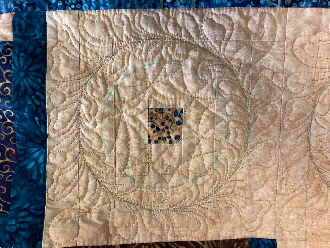 Stitch in the Ditch (SID) in monopoly around each of the 64 squares was done a while back, so I started FMQ with a feather wreath in two tones in each of the 16 wheat colored squares. Slow going as I am using two different color threads and doing one go round in the gold and then a second doing alternate components in the brown. A spider web type motif fills the center.
