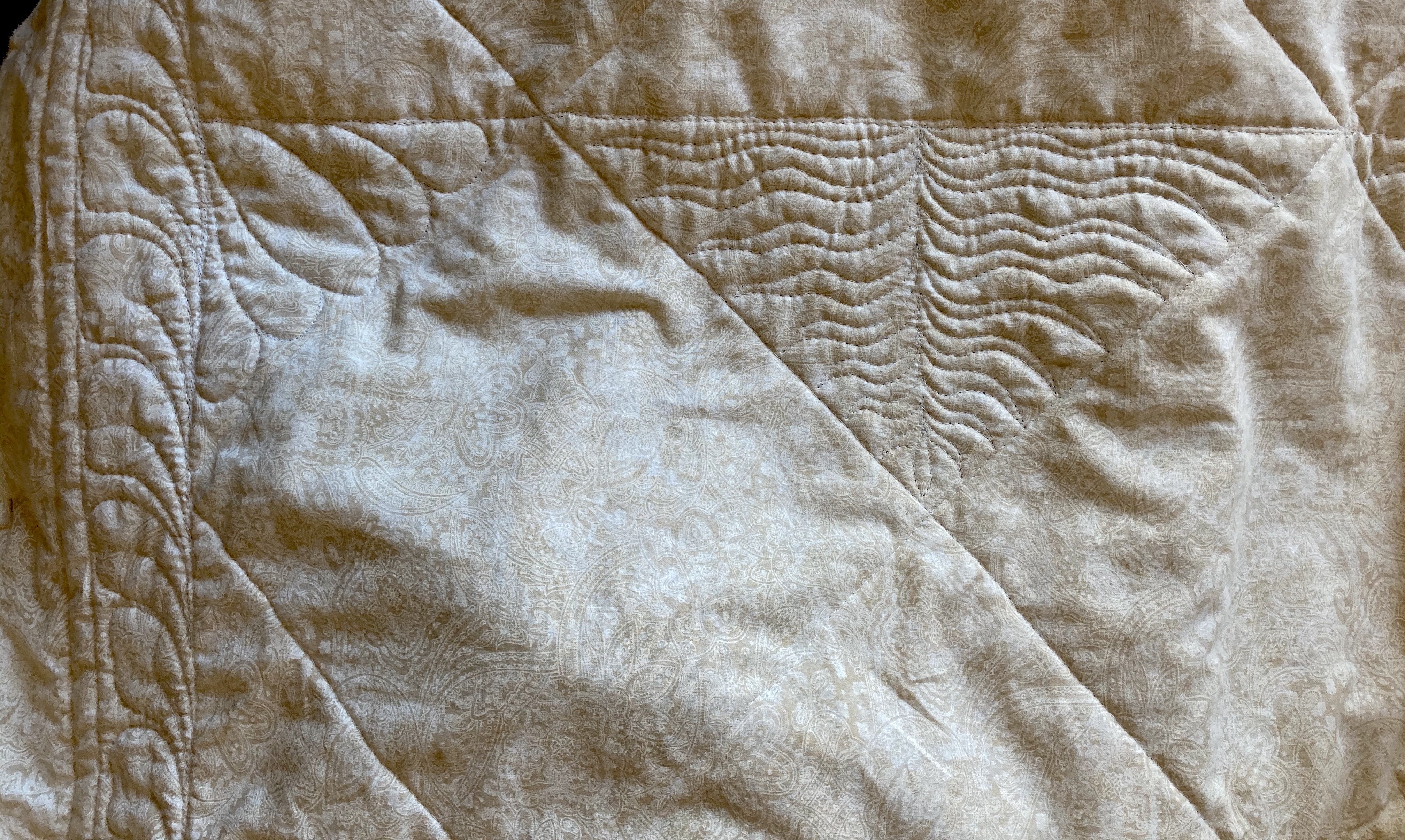 I did SID on the square blocks and each HST pair, and around both the borders. Once you have SID, it really frees up moving your quilt around and you can stitch anywhere you like. I needed this done quickly, so opted for motifs that I am familiar with done in a larger scale than I use on my wall hangings. I did include a new-to-me motif, the featherette, which is taught by Cindy Needham.