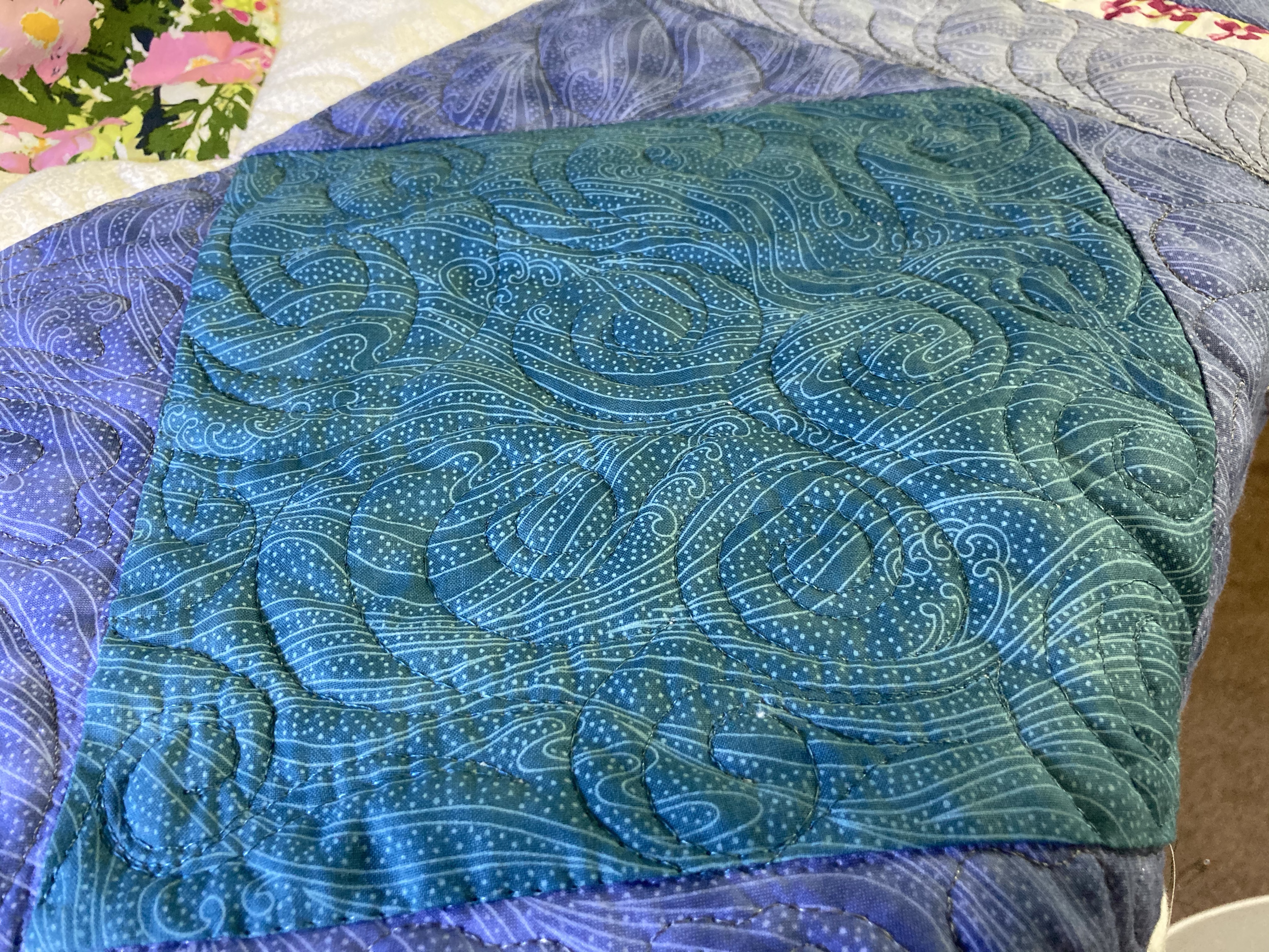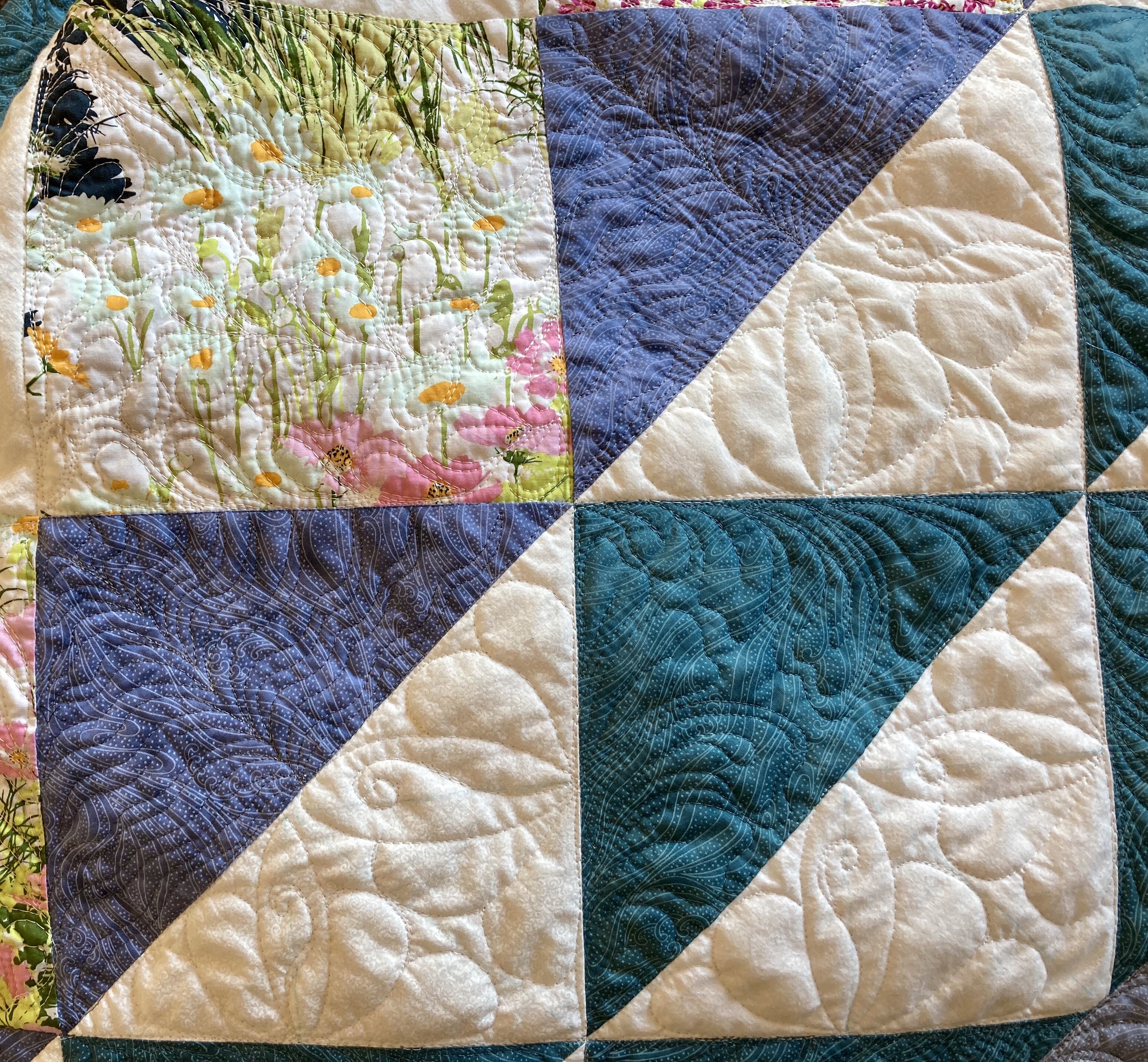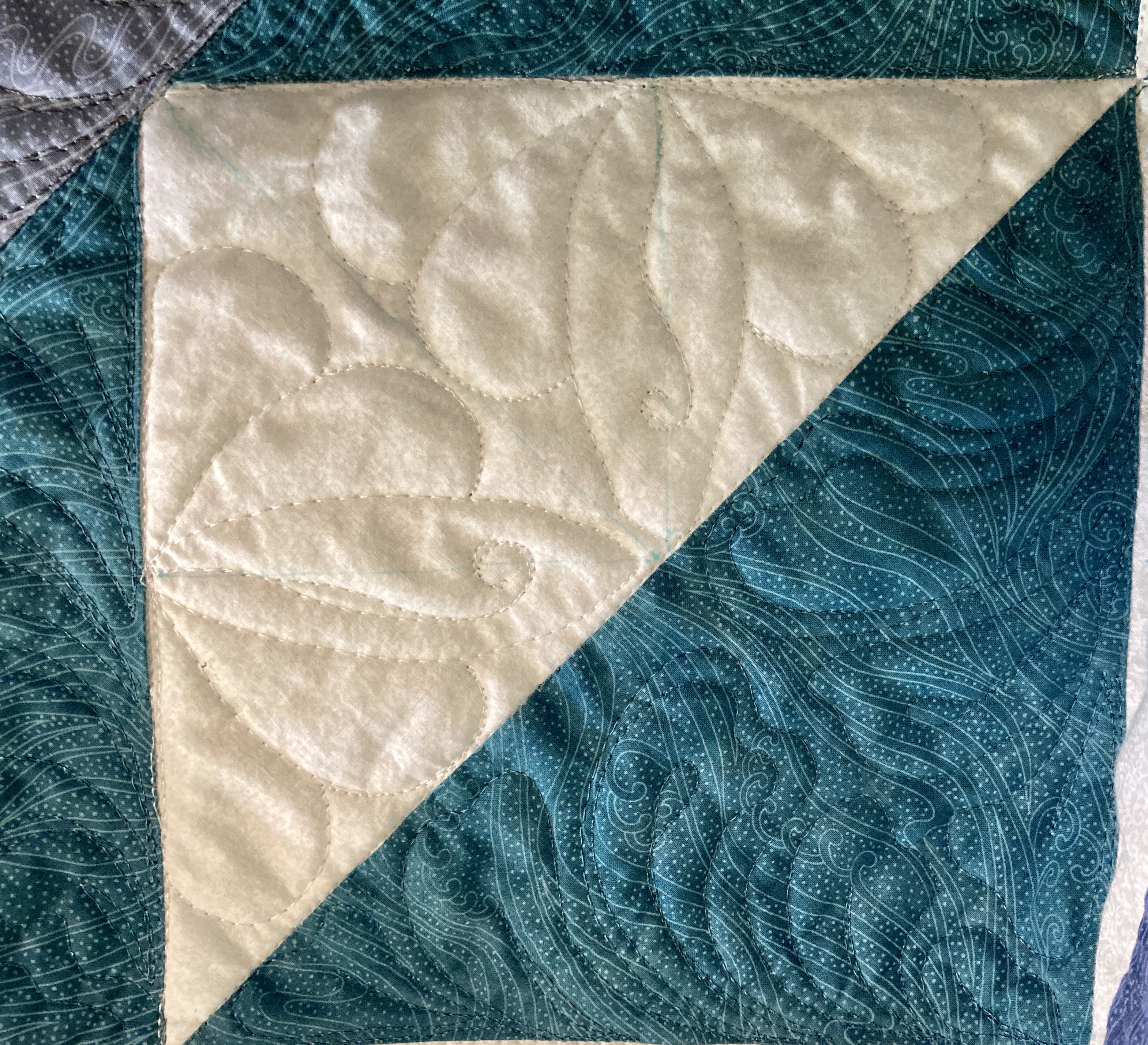Next up was teal twist and swirls swirls in the large teal squares. The teal HSTs were marking with ceramic marker down the middle and feathers traveling along each bias cut side. The teal squares were quilted using swirls.