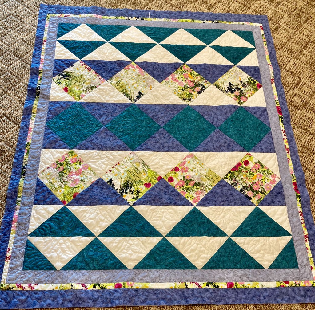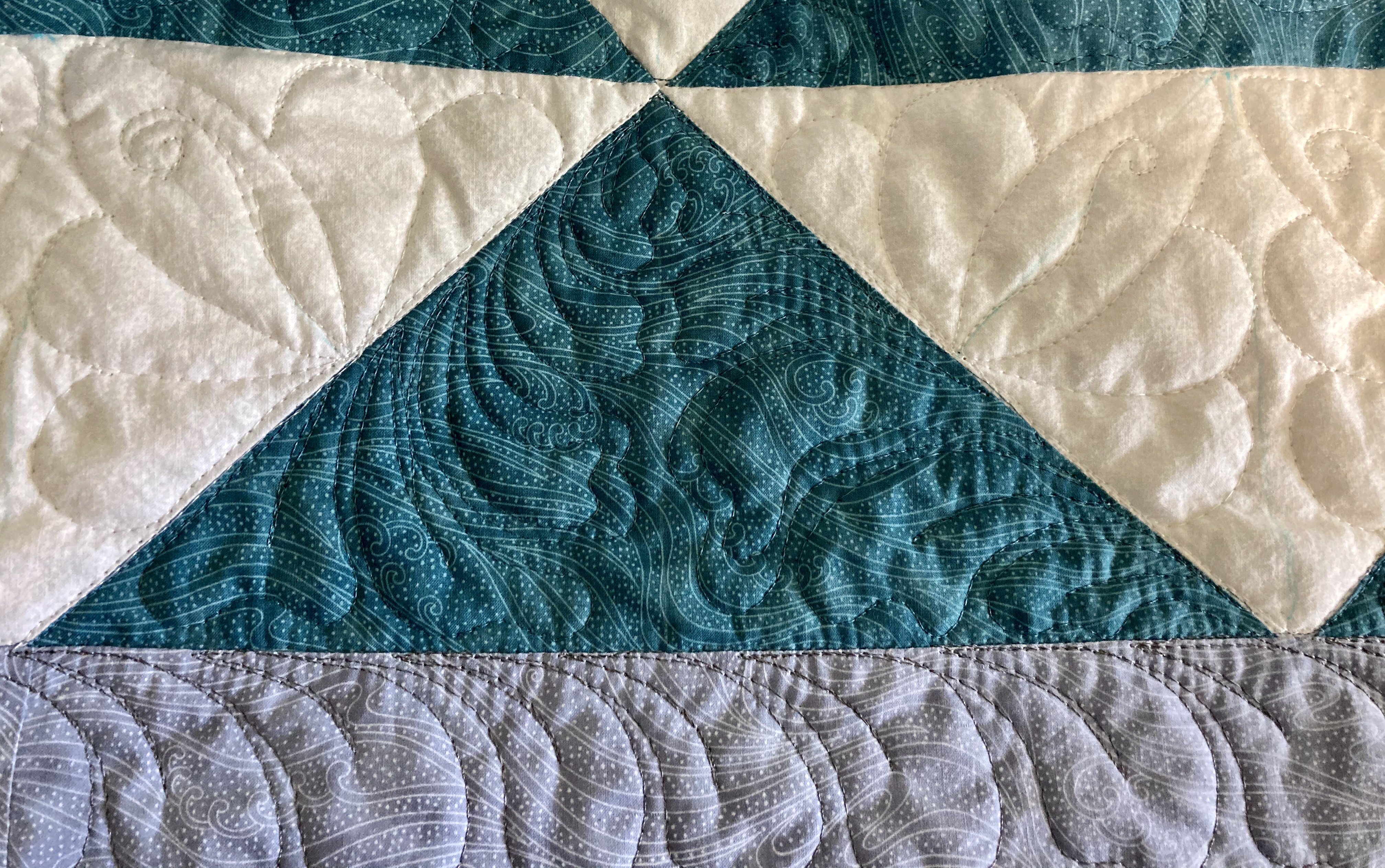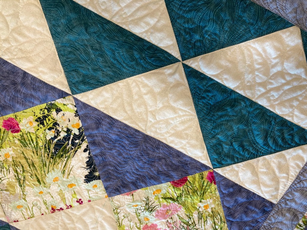 Next up was teal twist and swirls swirls in the large teal squares. The teal HSTs were marking with ceramic marker down the middle and feathers traveling along each bias cut side. The teal squares were quilted using swirls.