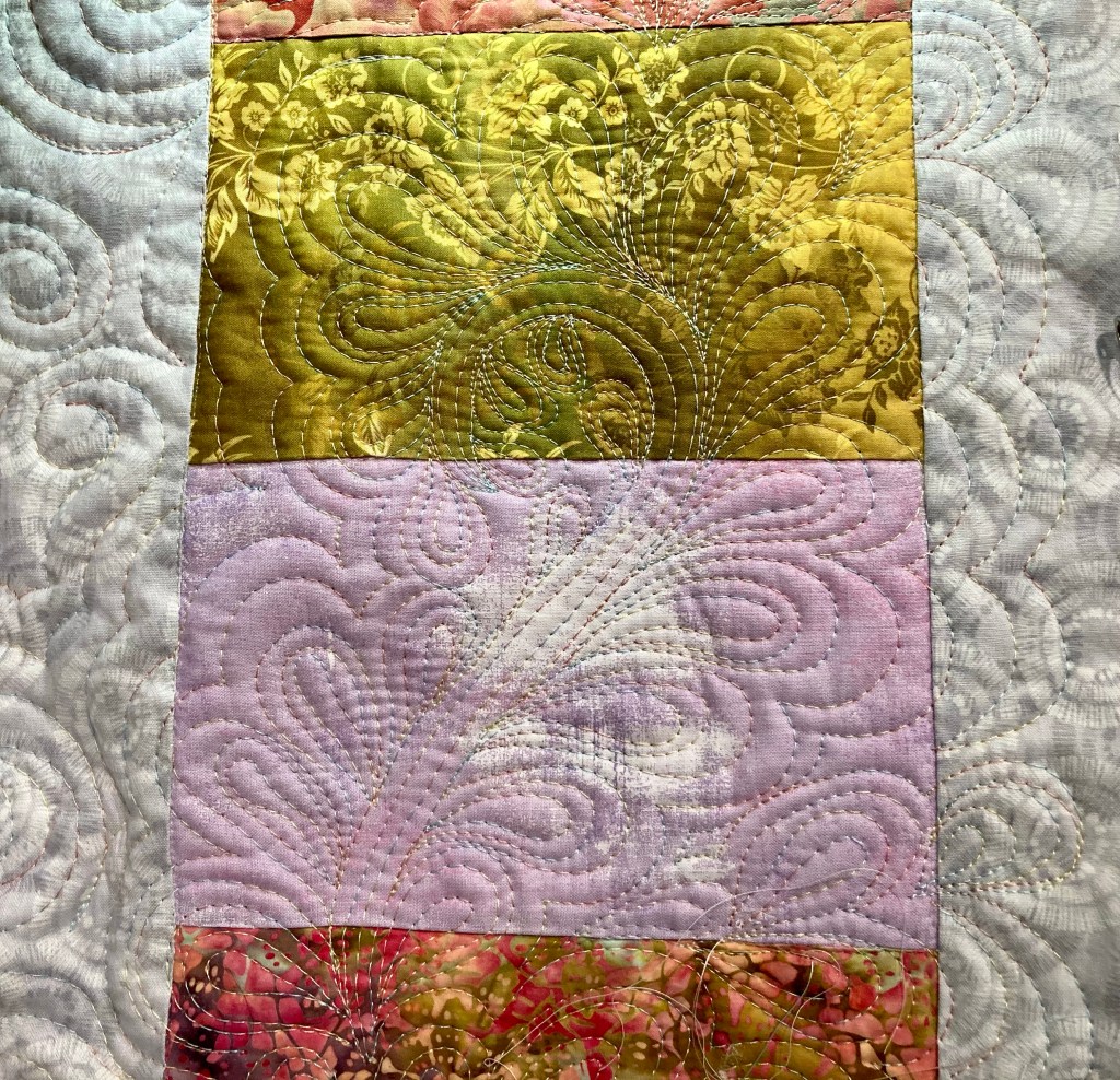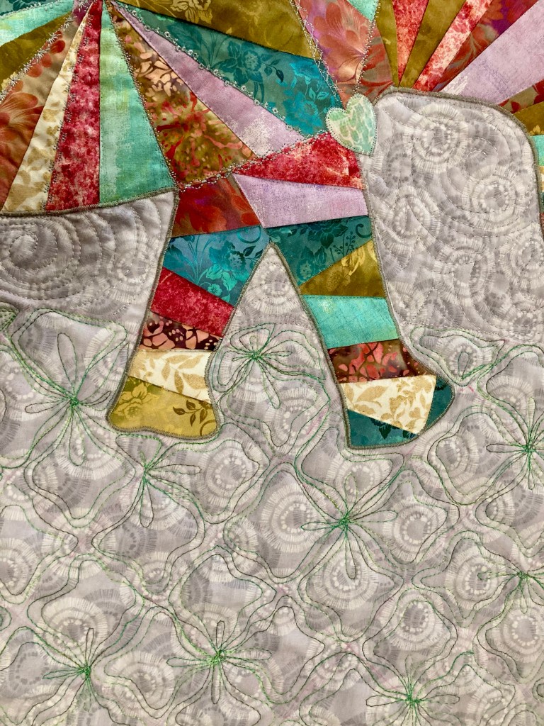 A variegated blue/gray/white is use for make echoing swirls for the “sky” background. The bright yellow sun in the left hand top corner is a feather wreath with big rays trailing into the sky. the right side with the color blocks is quilted in paisley feathers. That is a pastel thread and difficult to see. Esmerelda is walking on “grass” created in a variegated green using Sandra’s “Wildflower” design (also available on YouTube.) First time doing the paisley feather and the wildflowers.