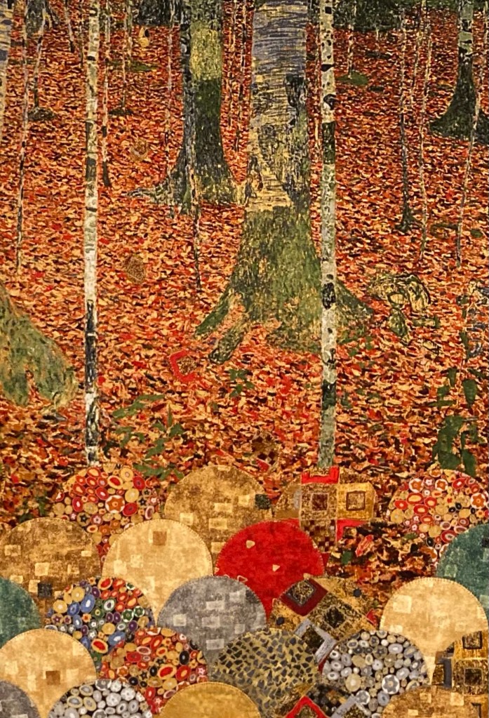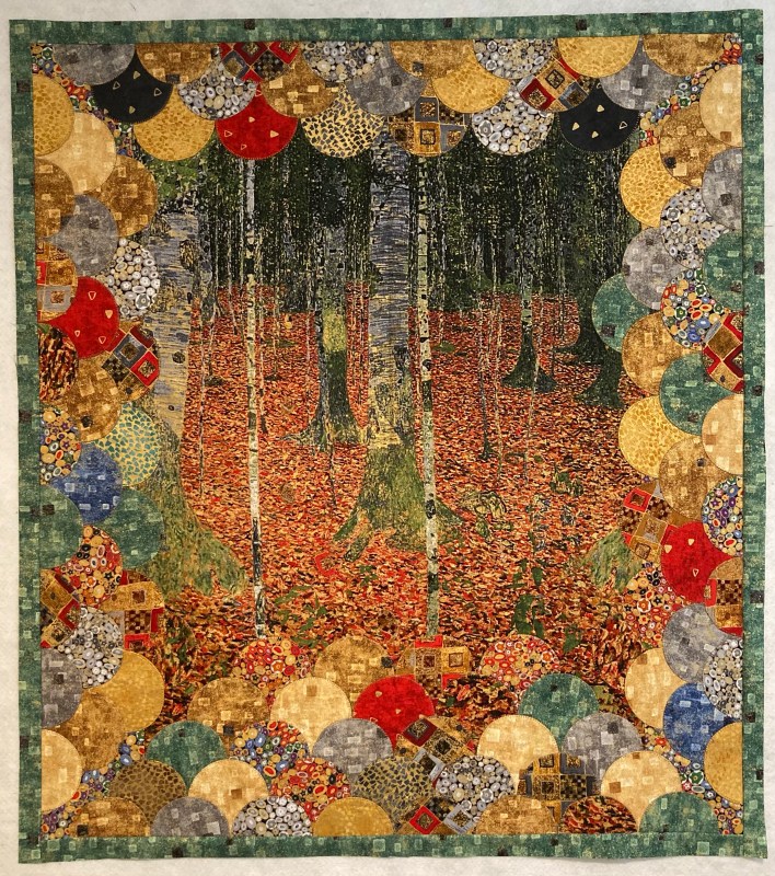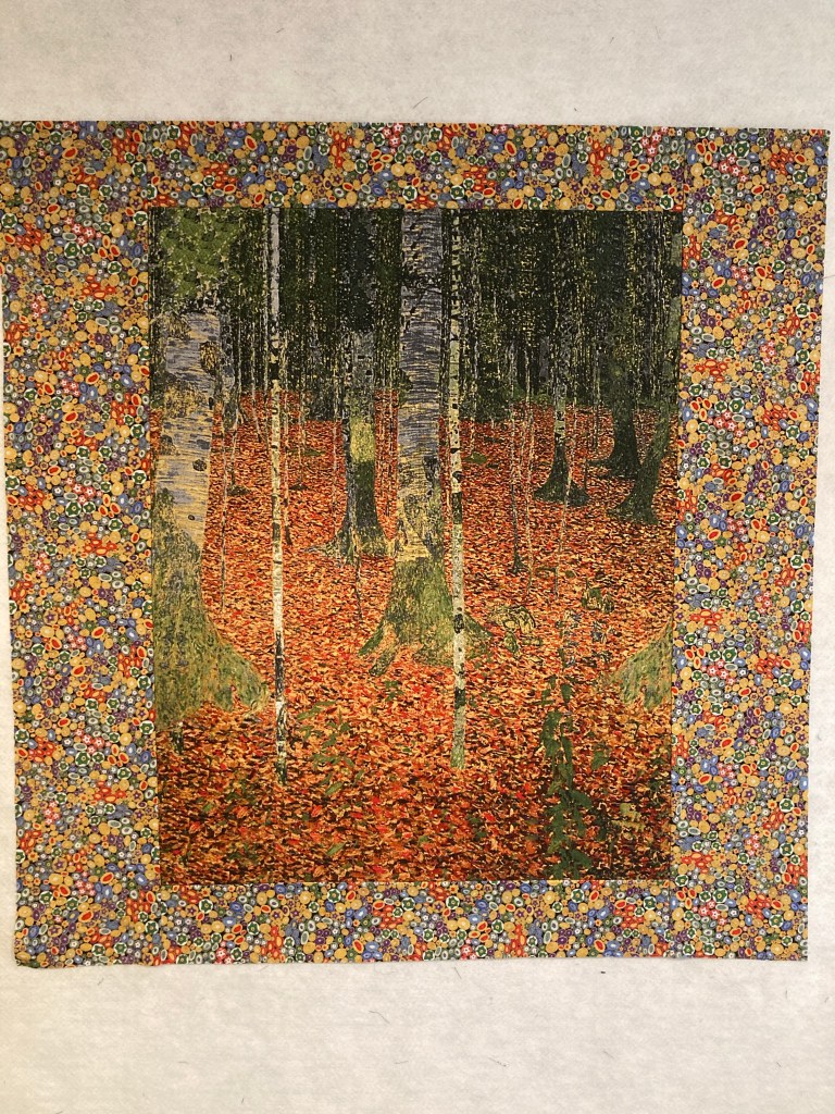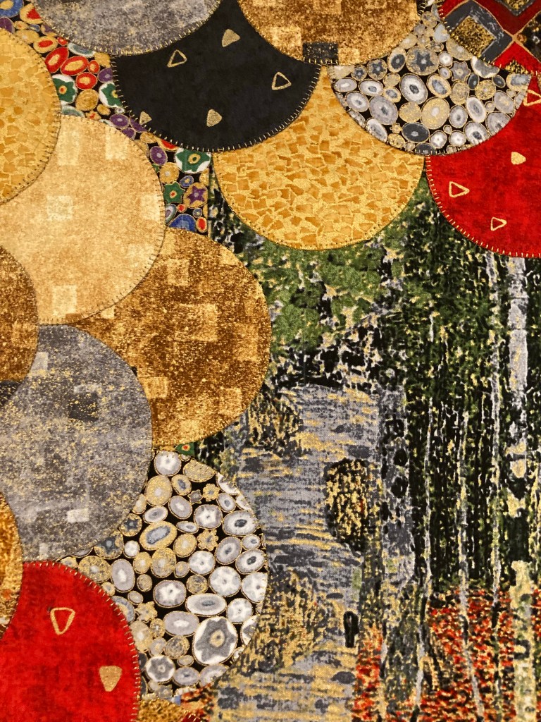 But after the African panel, which I loved making, I felt a challenge to take a panel and make it really interesting and fresh. The quilter’s brain can be demanding. Off I went in search of Klimt panels and found that the Birch Autumn panel was still available.