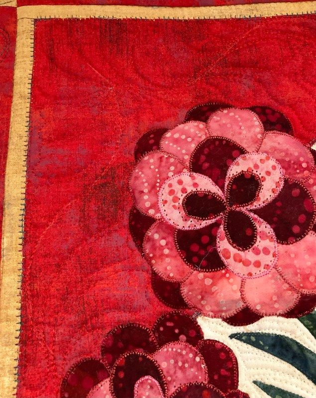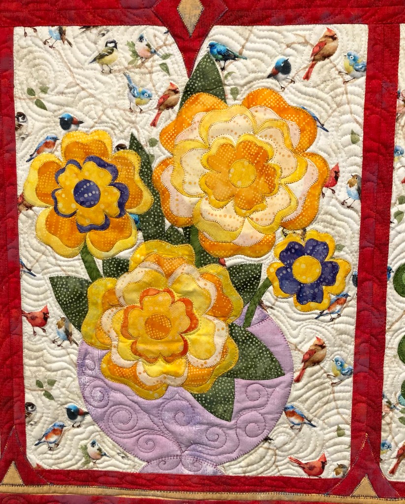 I shared the first two blocks in an earlier blog, and now you can see the lower window sill of flowers as well as the quilting.