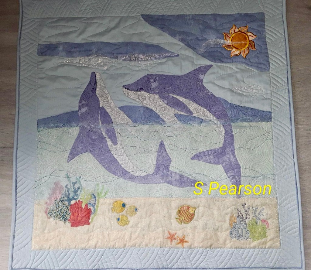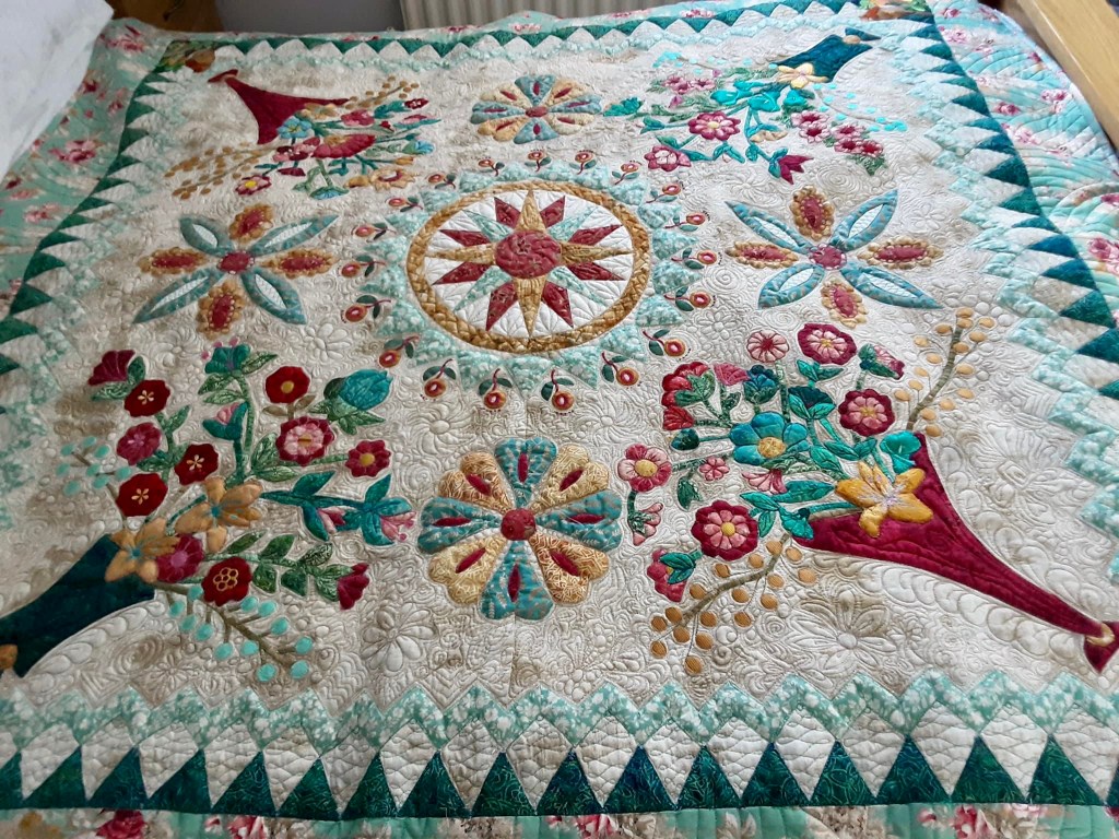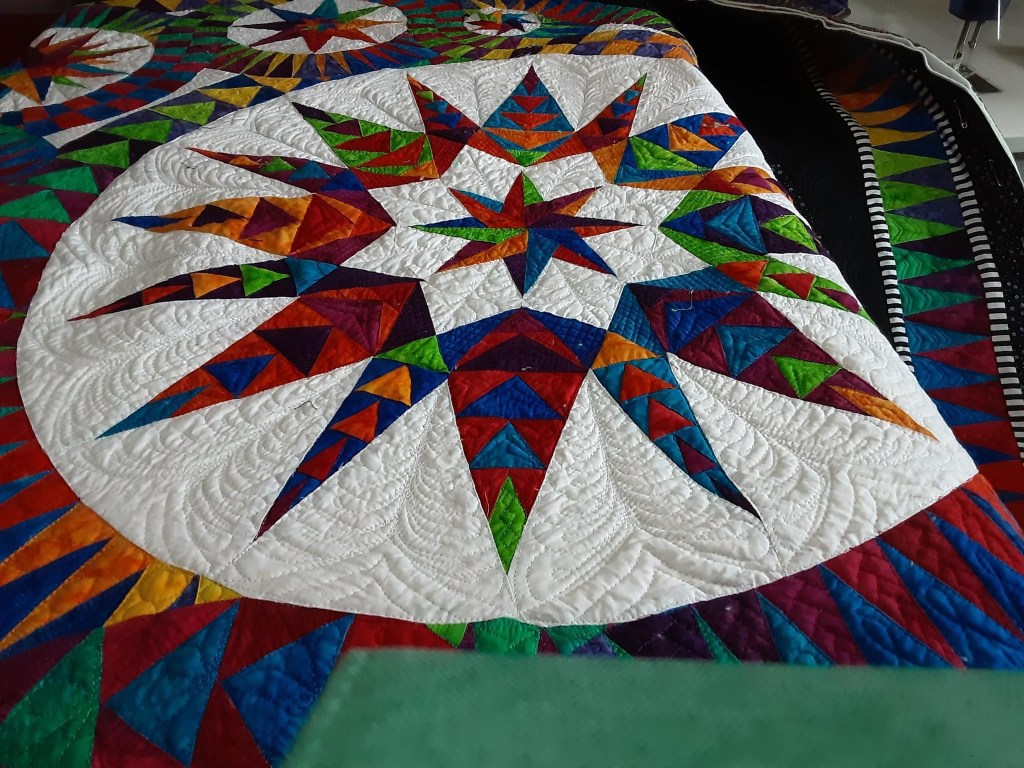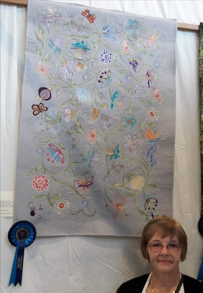 Sandra lives in York, England and we “met” in a FB free motion quilting (FMQ) group when I first began to attempt FMQ about 7 years ago. Over time, we both became admins for the group. Sandra was a natural choice for group admin as Sandra’s primary quilting love is whole cloth quilting and she is very accomplished. Why I was selected is still a mystery to me because at the time, my FMQ repertoire was severely limited. I could do consistent swirls, poppies and well that’s about it. A definite beginner.