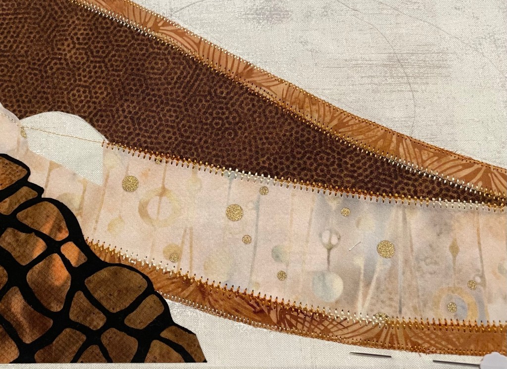 This required a fair amount of rummaging through my stash and after a false start, I selected a basic brown blender for the dirt. Next was the pot and I used a bit of a fat quarter that I love but have only used a tiny bit of. It is a light flesh tone with pale blue drips and metallic spots. The rim of the pot is a flower print gold/tan batik. I used a double-double blanket stitch to define and highlight the area between the pot and the dirt and the dirt and the rim. Double in that it goes both east and west and double-double in that it takes each stitch two times. I left the width at the standard 4.1 and reduced the frequency of stitches down to 1.5.
