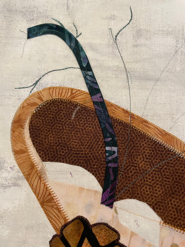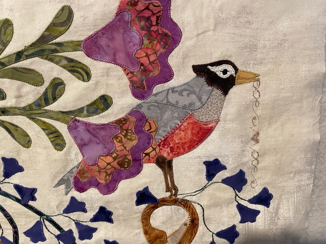 The lighter stems were made with my smallest bias strip maker and added. The dark leaves were added next. And then two of the flowers and then the Robin. I found some peachy printed batik scraps in my applique fabric bin and added them to the flowers to reference the Robin breast. The Robin breast is a bit of Stonehenge fabric. The Robin has the only non-batik fabric in the block. I used the double double blanket stitch here to add some coral to edge of the Robin’s gray feathers. A rose gold metallic chain is carried in the Robin’s beak.