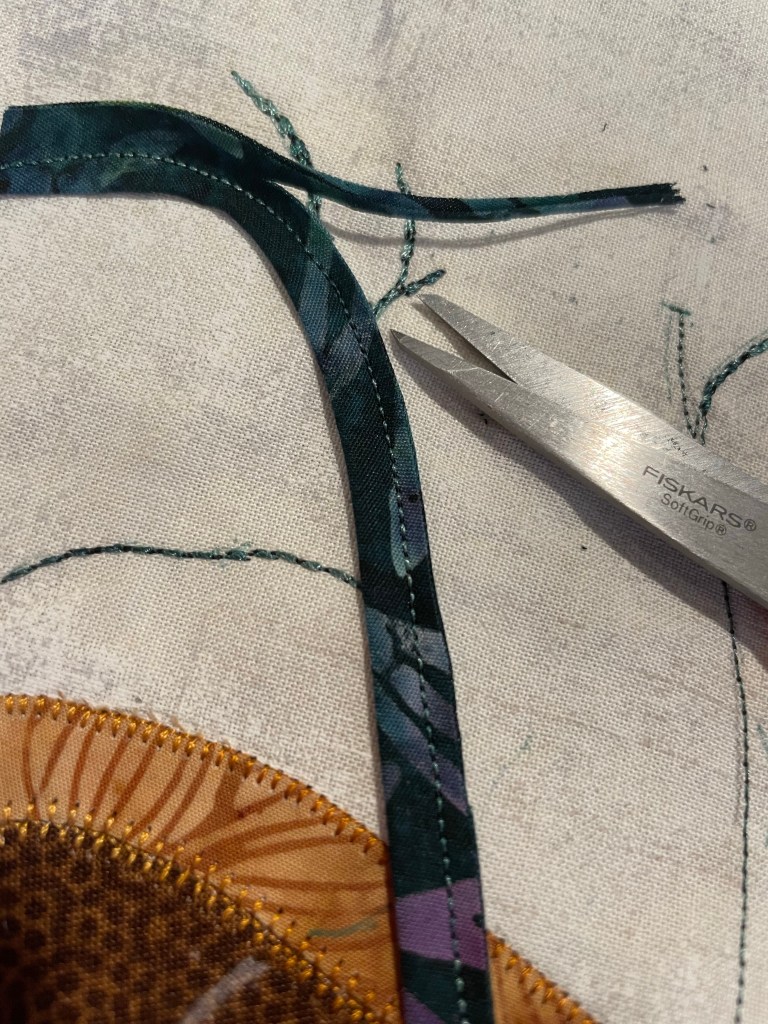 A half inch bias strip is folded in two and stitched down the middle along your placement line. I stitched my tiny stems before adding the bias strips.