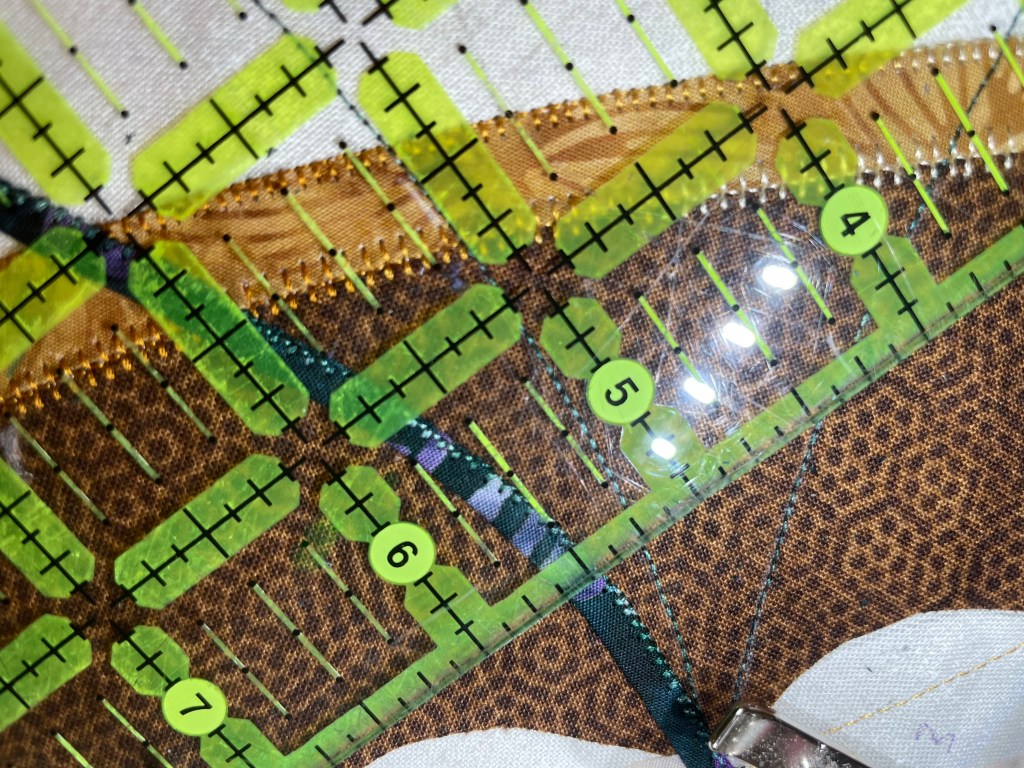 Adding my large leaves. Dark stems and leaves were applique with a purple/teal variegated Superior Threads Fanstatico.