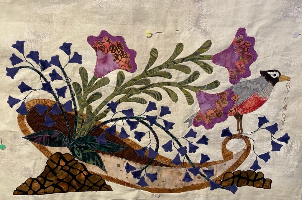 What did I know when started this block? I knew I wanted bright flowers, I knew the Robin would be gray and coral (which would also pick up the coral in the first block) and I knew that I wanted two tone stems. I knew that the blue bells would be the dark, intense blue that was in my cornerstone blocks. I knew that my batik that looks like rocks would be used. I knew that I wanted “dirt” in the pot at the base of the flowers. I start with I know I want and improvise from there.