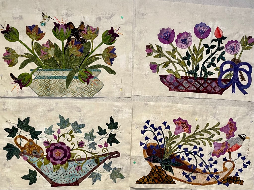 What comes next is equally challenging, because it is NOT “all planned out” and the more repetitious and technical phase of applique quilt construction begins. (Like making sure that all my components can fit together!)