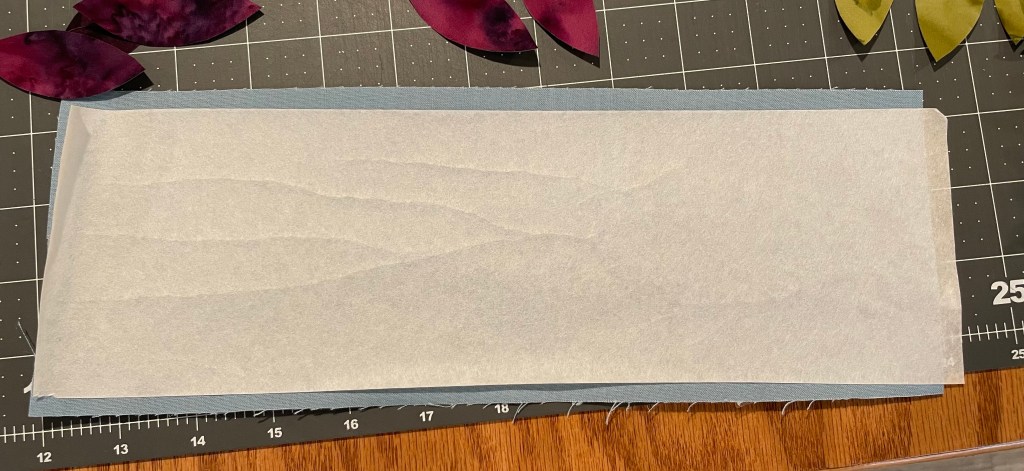 - Adhere like pieces in sections. I find that if I adhere an entire block at once, some smaller pies or corners may lift up as I stitch other areas. I tend to adhere a group of stems, then stitch them. Then the next group, then leaves, then petals, etc. If I have a color group using the same thread, I do them as a sewing batch. On the SG Robin Block, for example, I added 5 bluebells on the left of the block, and then stitched. And then 5 more towards the middle, etc.