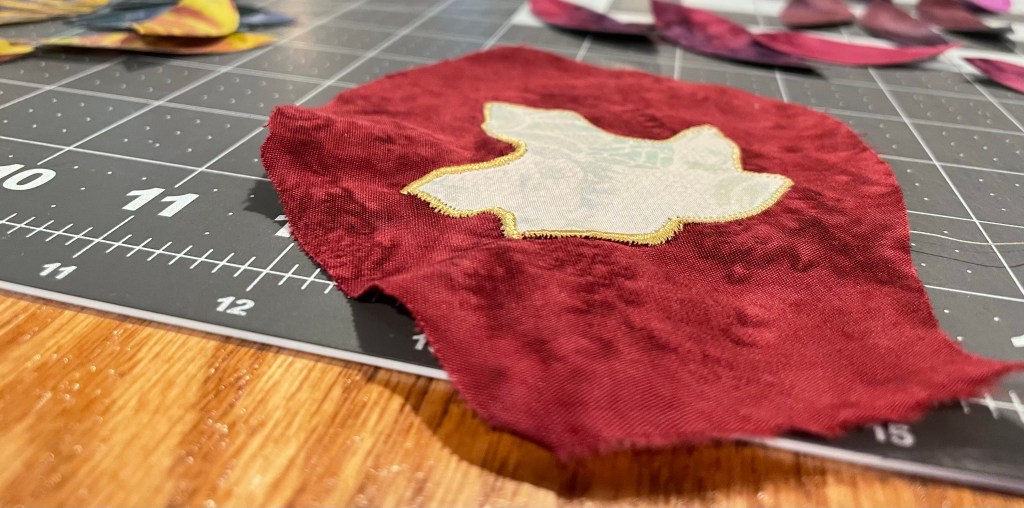 - Use GOOD quality fabrics! My favorite combo is a Moda grunge background with batiks. Batiks also make a good background. You want a good thread count and weight to support your applique pieces. Batik is the best medium for applique, IMO, because of the higher thread count and a lower tendency to shred. When you are doing raw edge, you don’t want shredding edges on your curved pieces.