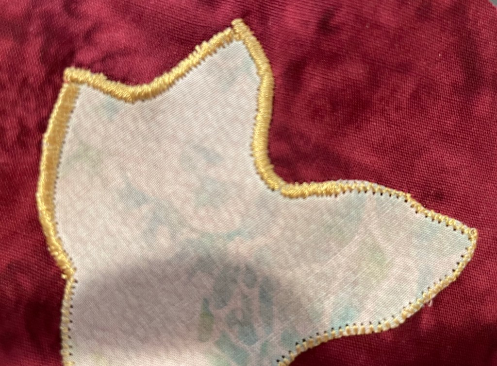 - Use a blanket stitch for main applique if at all possible. If you don’t have a blanket stitch, a small, tight zig zag or satin stitch can be used. If your satin stitch is too tight, you will get tunneling. Starch and stabilizer can reduce tunneling, but test with your actual fabrics FIRST to make sure you like the results.
