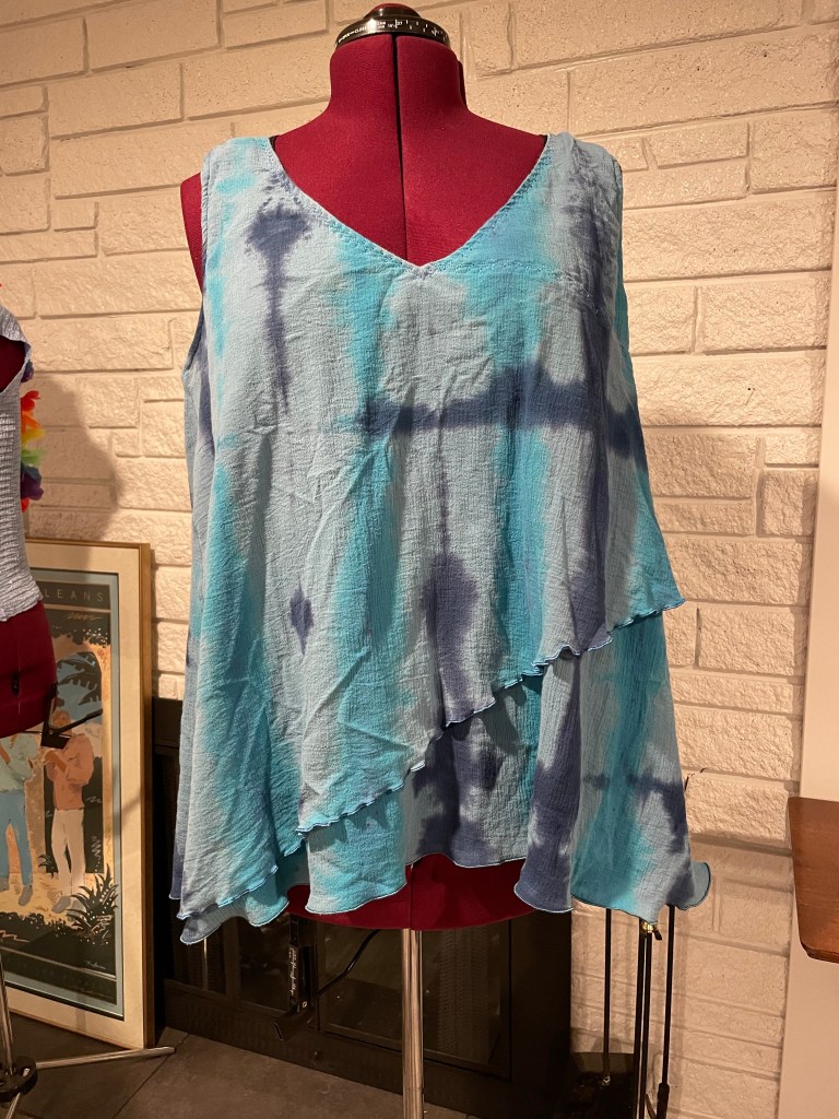 This year’s crop of perfect pattern creations is rolling off my assembly line. I have tie dye versions, crinkle gauze and waffle gauze versions for easy care and wearing around the house and garden or out to the geocery store. Cotton gauze is by far one of the cheaper fabeics available (only $4.99/yd from Vogue Fabrics online) and comes in a dozen colors. This means I can make a gauze top for about $15! And it will last for at least 4 years of regular use. I have also ordered some plain white and lavender for more tie dye adventures.