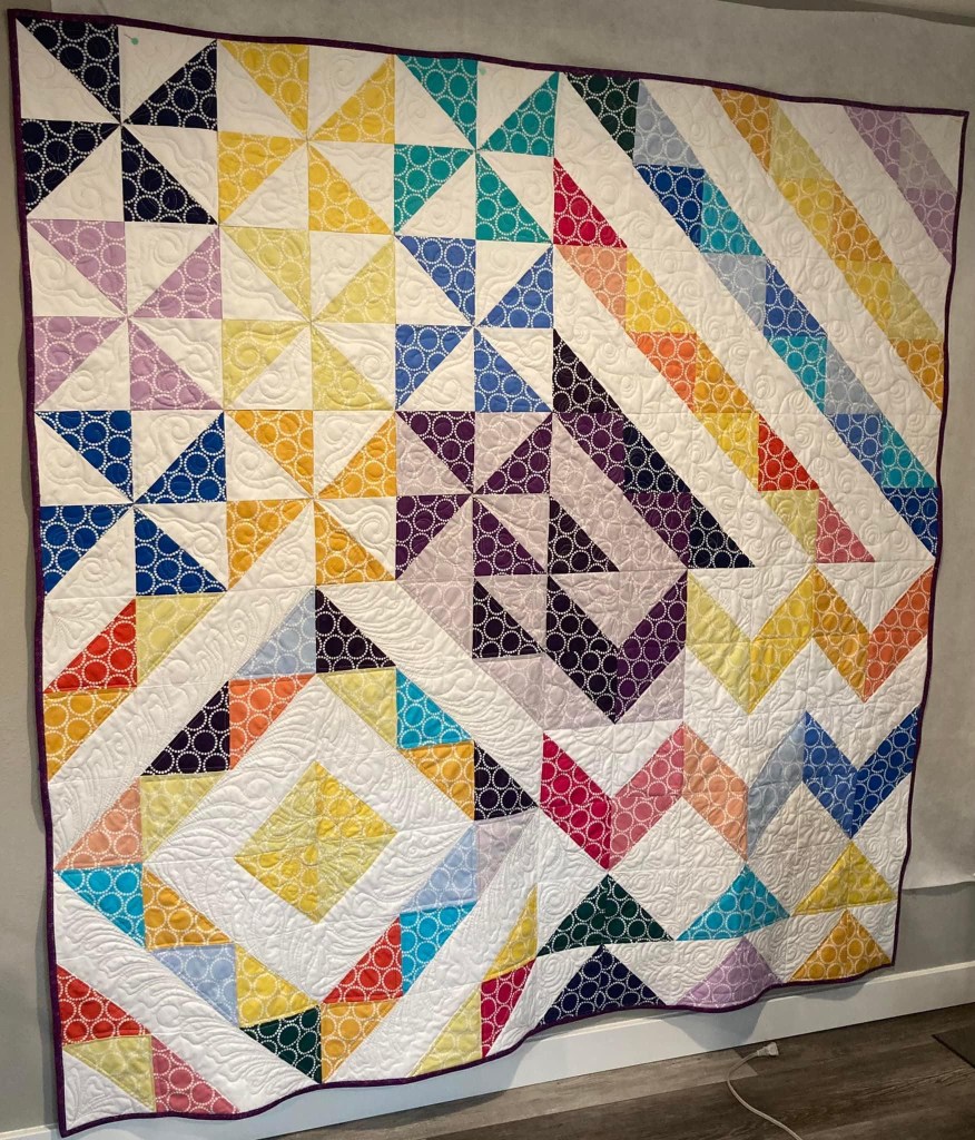 Below is the Sampler style quilt made from10″ layer cake squares (one of my WIPs) using half square triangles. This one was gifted to my niece Emily.