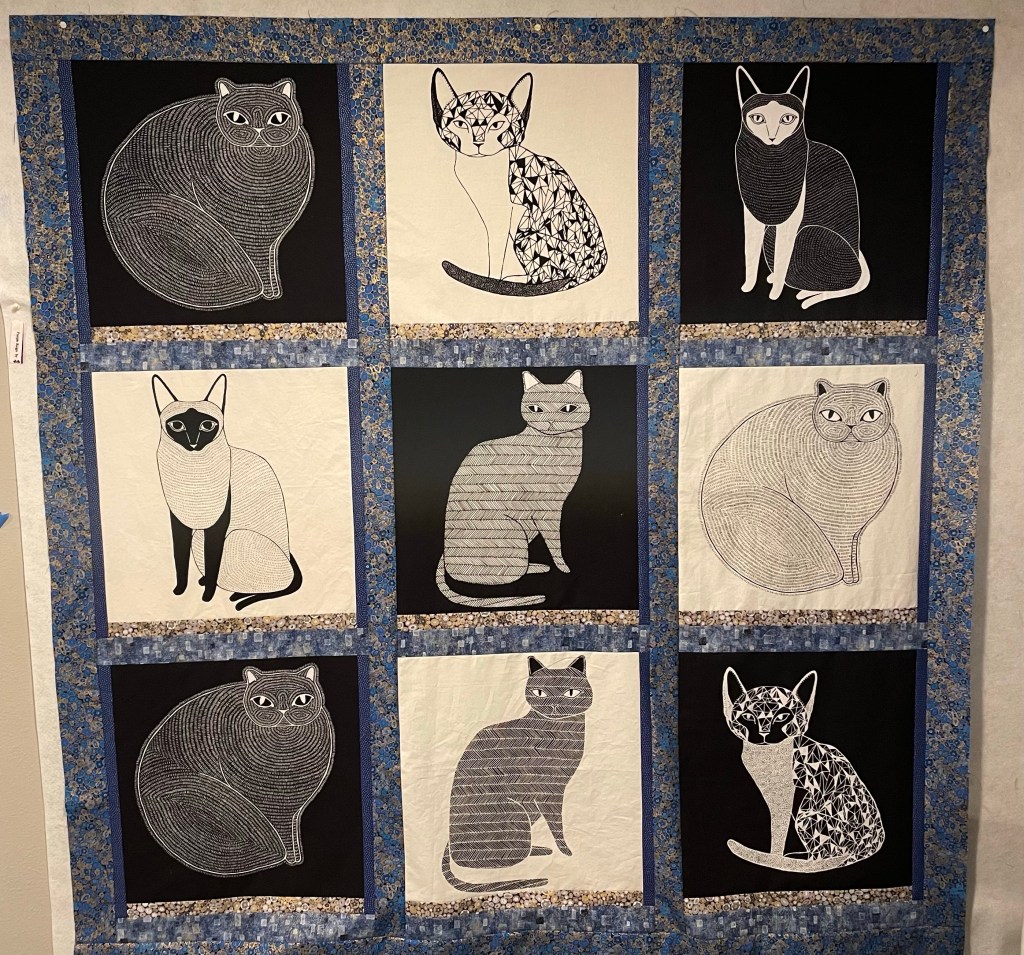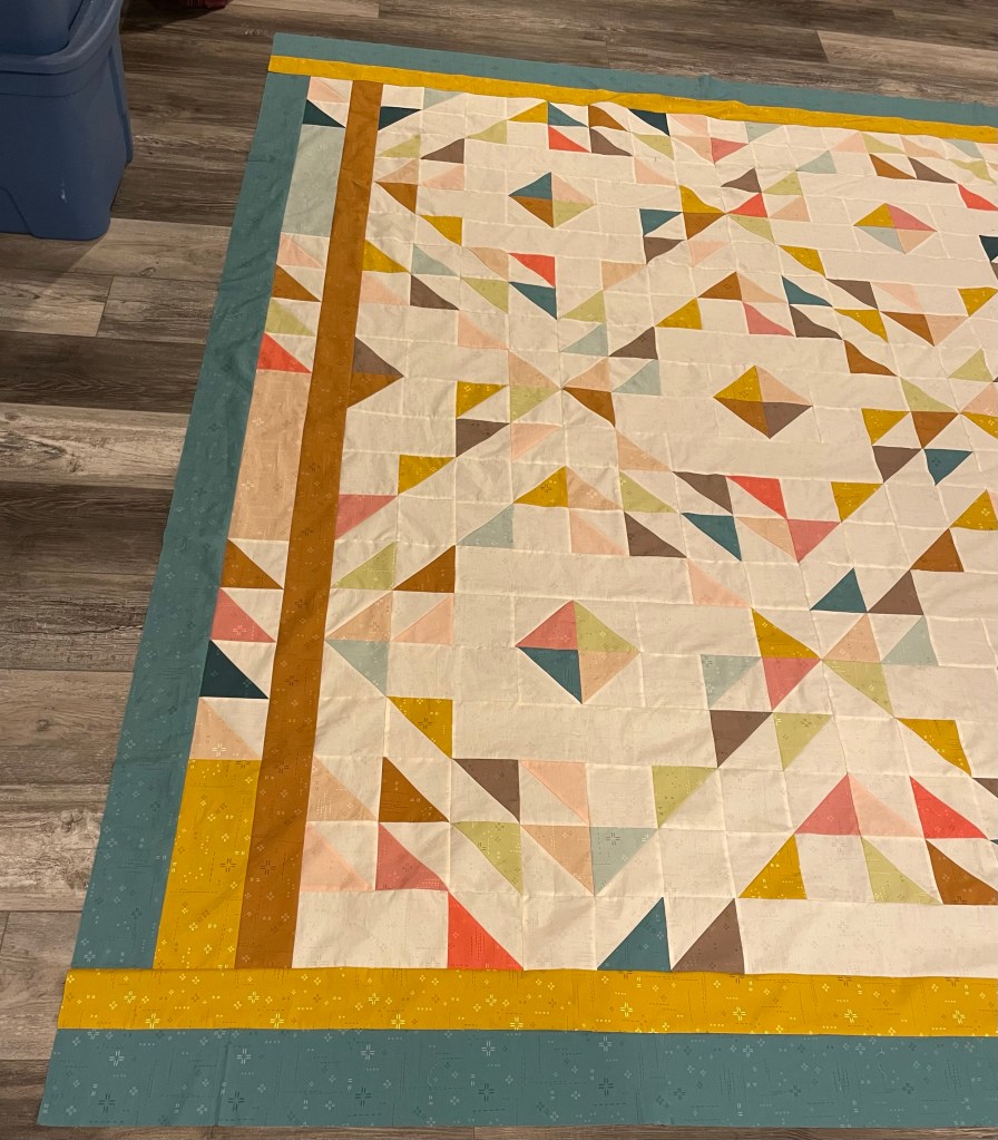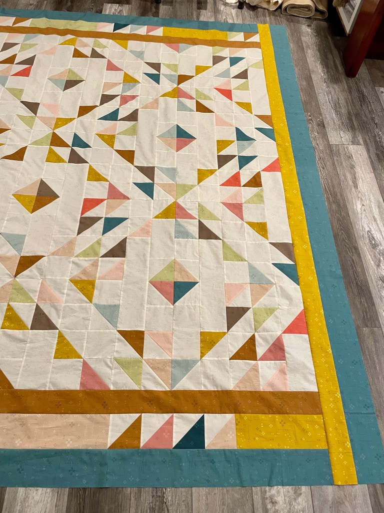 Below is the completed Summer Haze project. It is 102″ square and won’t fit in one photo!! While I have completed the top, I haven’t been able to sandwich and quilt due to health issues. I may send this out to be quilted, which would be a first for me. Hmmm.