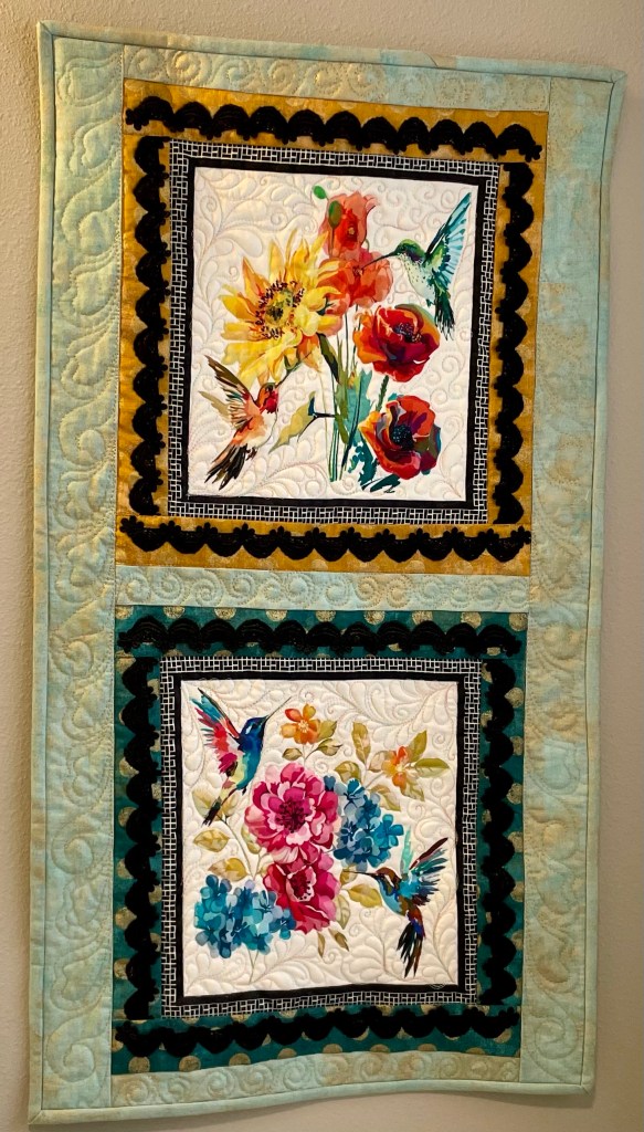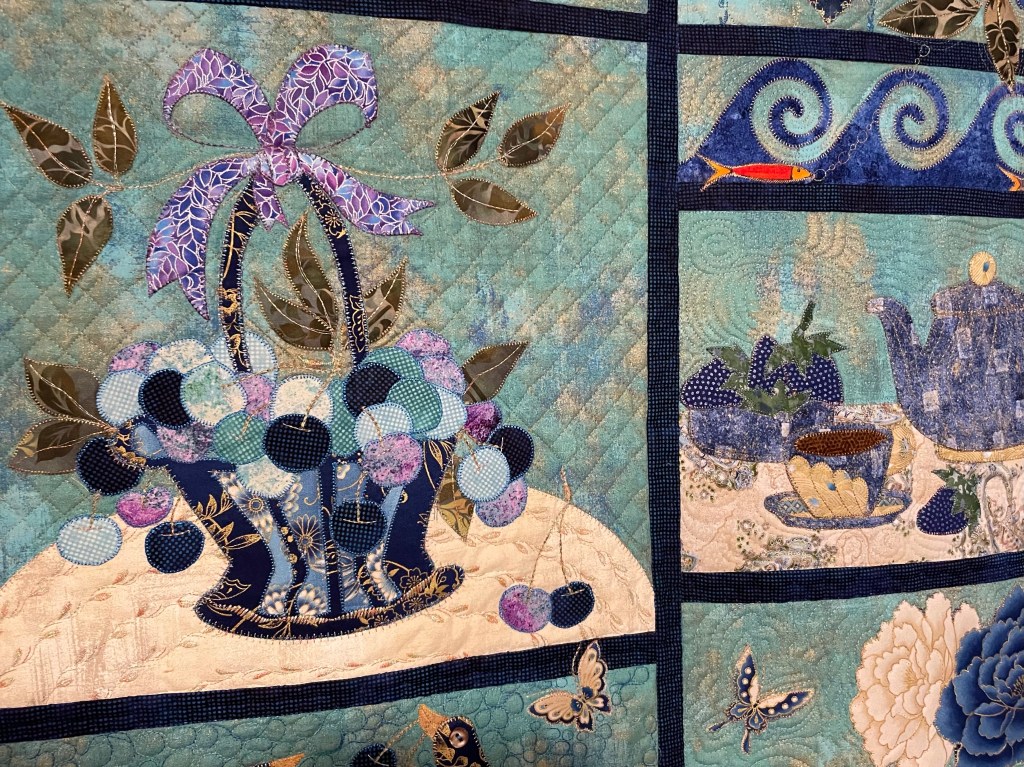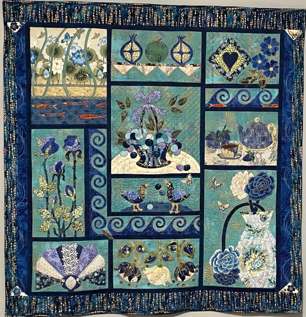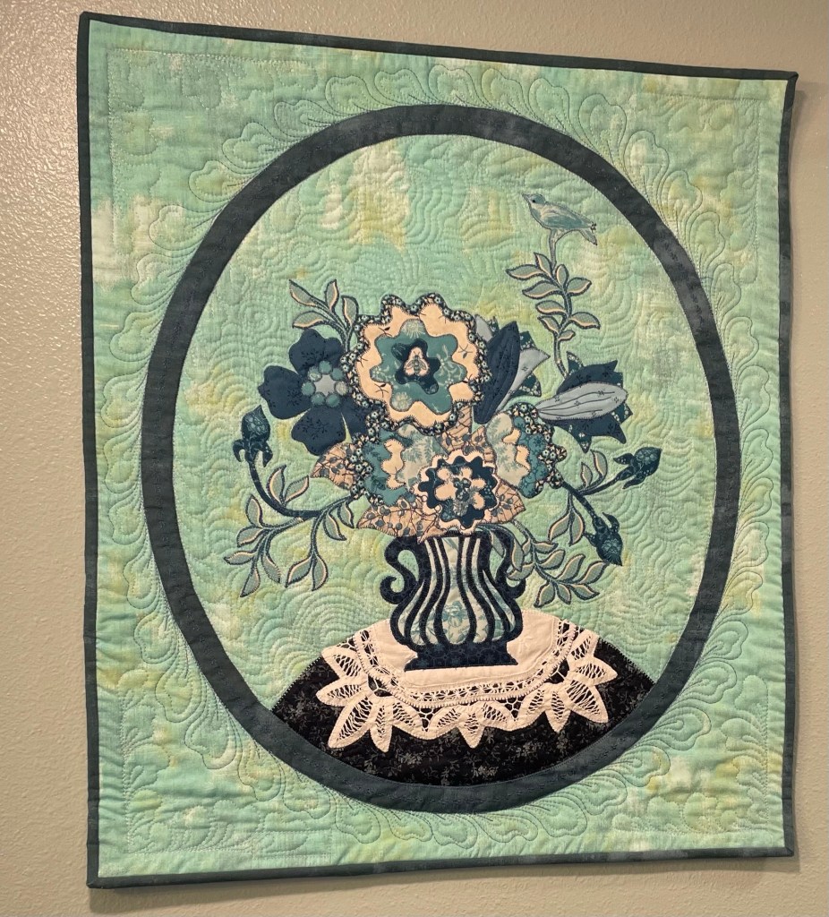 This is a variation of Esther Aliu’s Red Delicious, done in blues, which I call Deliciously Blue. I made it specifically for our new home in 2021 and it hangs in our bedroom. I look at her each night and each morning and sometimes stop to pet her. Occasionally I talk to her! And I also look at the FMQ for inspiration when pondering the quilting for a new project.