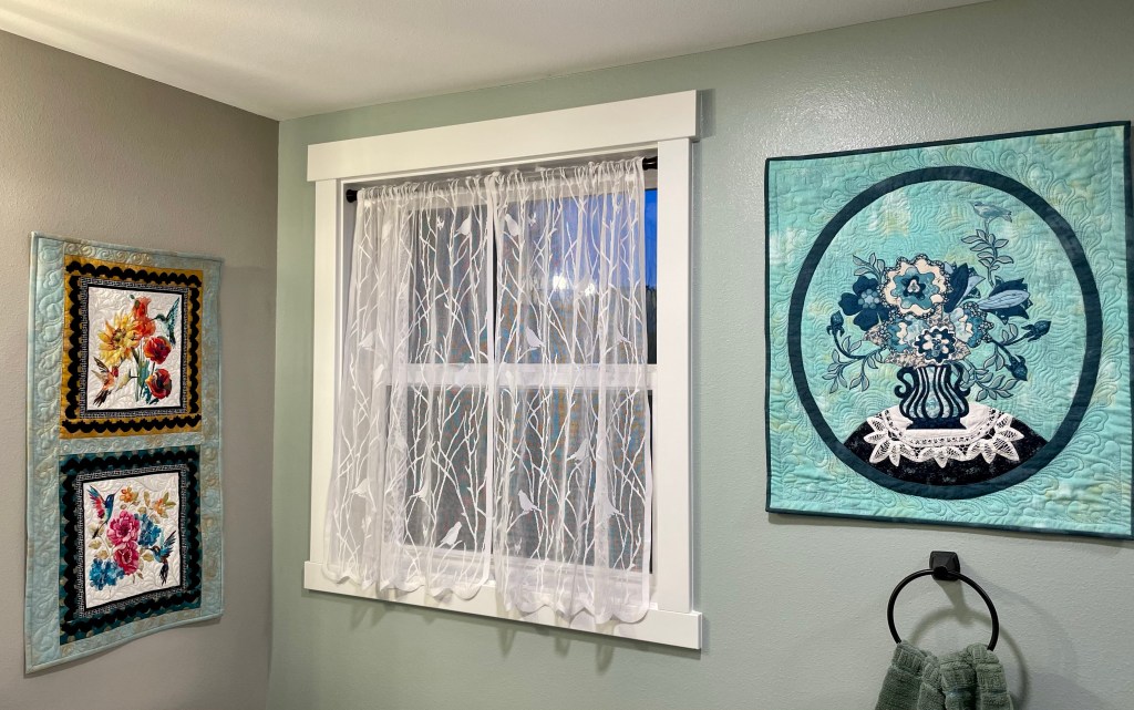 So what happens to all these quilts that we make? Some might wind up in a cupboard, but most go to a new home to spread the quilting joy. A few, however, stay home and brighten up bathrooms (Yes!), bedrooms and other spaces. Are they carefully curated? Or do they stay because no one else seems to love them?