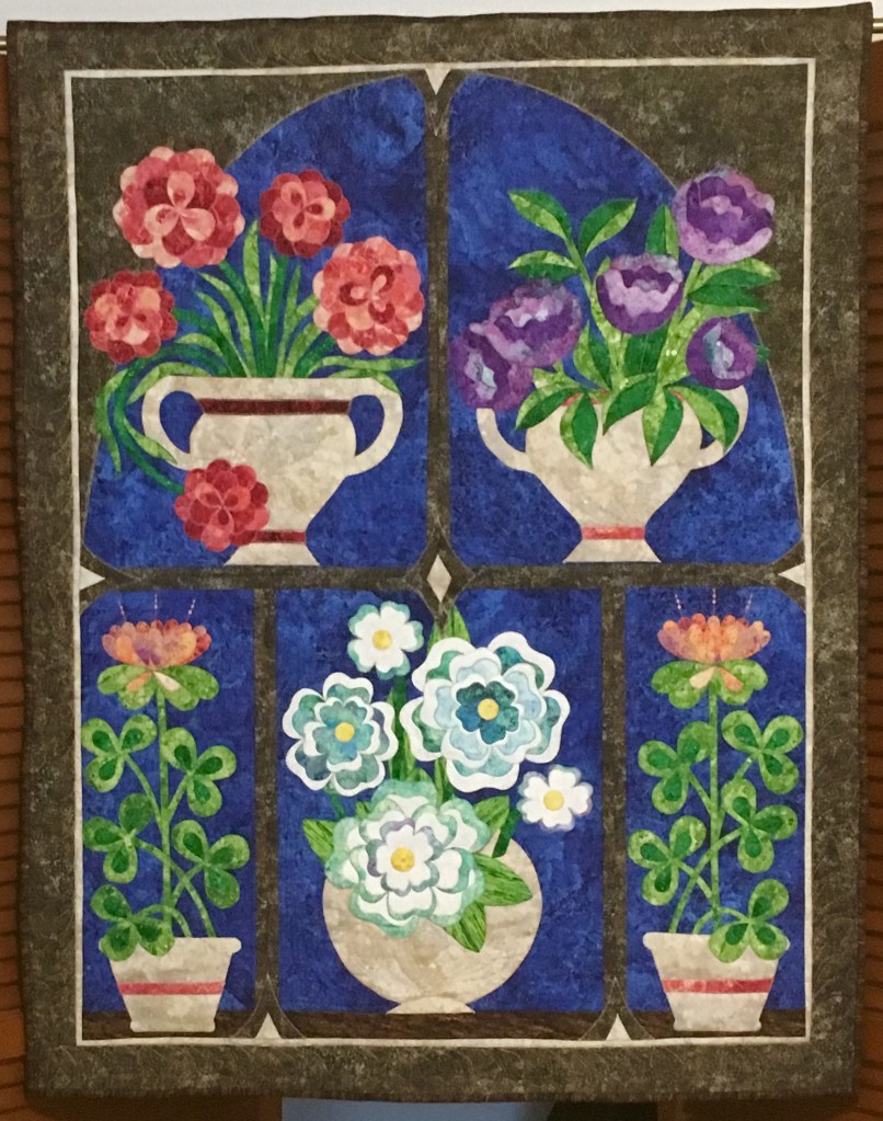 On My Window Flowers Bloom, also an Esther Aliu pattern, is done in Northcott Stonehenge fabrics that I found on a trip to Binghamton, NY. It is hard to find Stonehenge here on the west coast, but apparently the east coast is a treasure trove of Stonehenge! I love all the color gradations in this fabric line and the texture and depth it gives appliqué projects. This was my second Esther project and the first time that I used metallic threads for appliqué and FMQ.