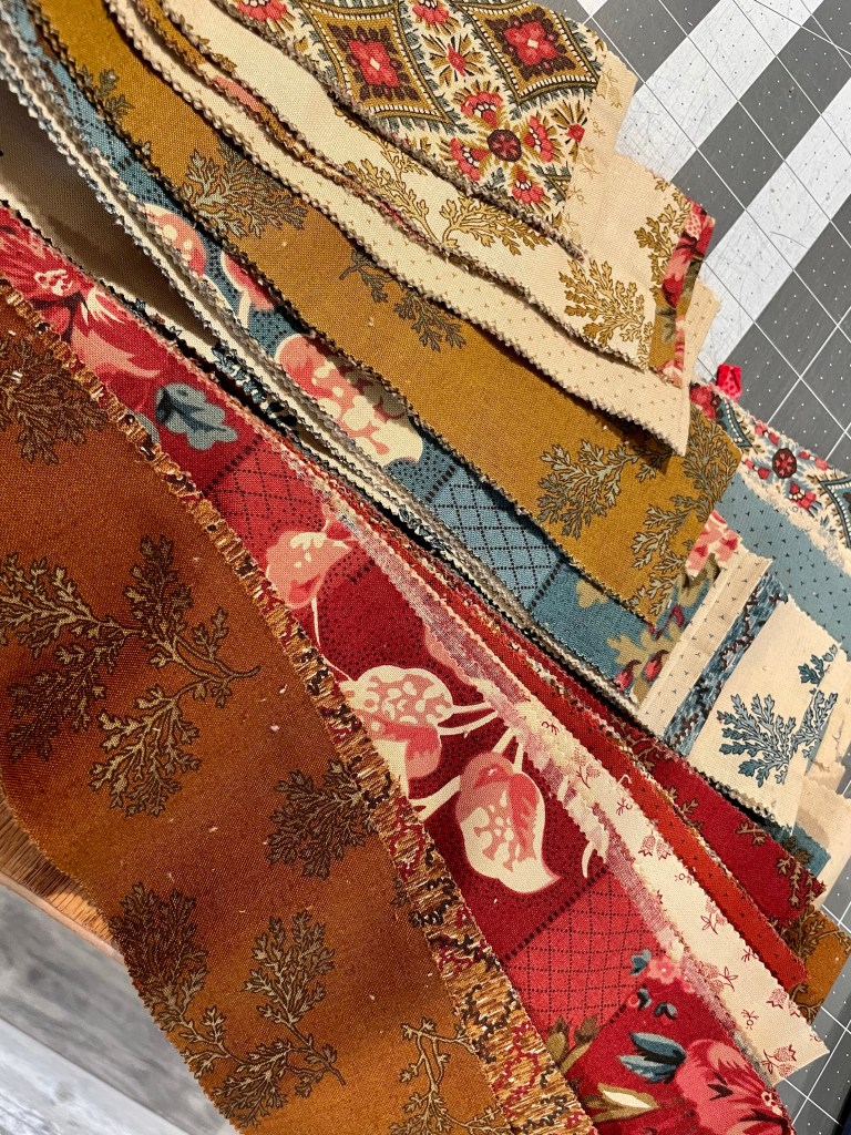 Right away, I realized there was a prime candidate. Two jelly rolls bought when I first started quilting seriously when I retired in 2015. Why did I buy them? I was new to quilting and they were on sale. Why haven’t I used them? They are reproduction fabrics and not really my style or color. I even packed them up when I moved two years ago and then unpacked them. Two round tributes to “what was I was thinking?”, a well known impulse buying form of fabric remorse.