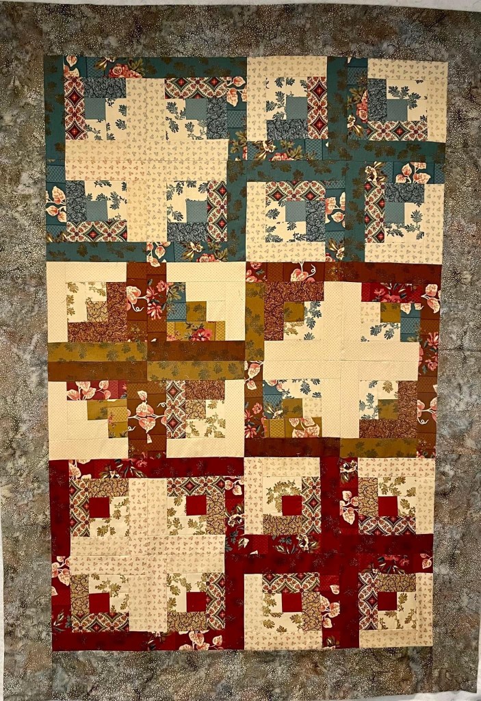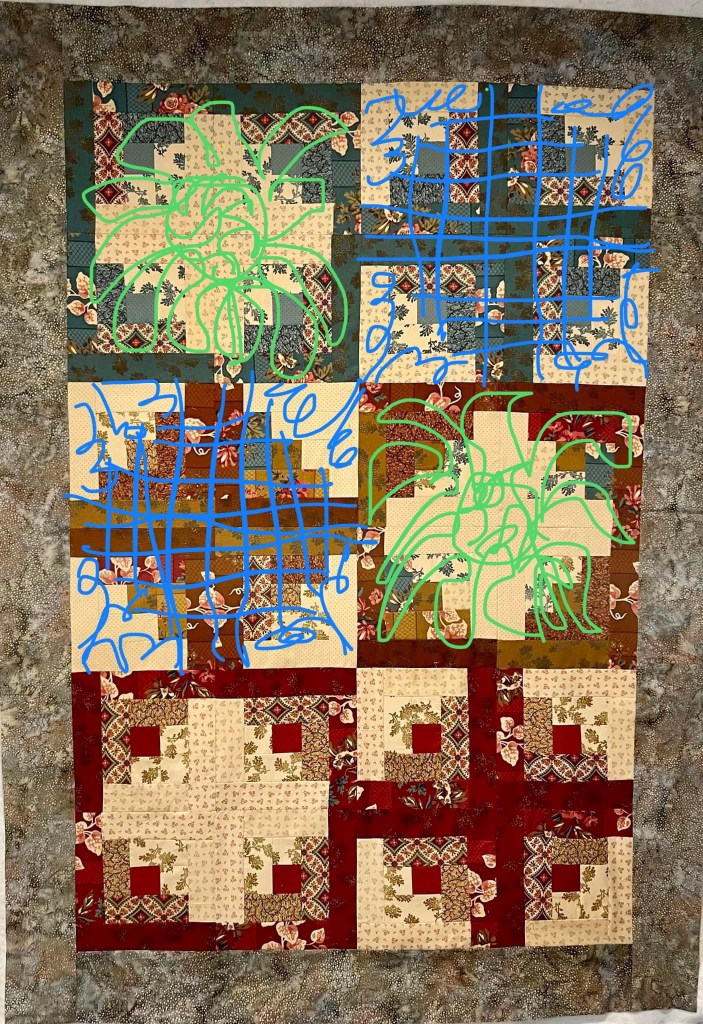 To start, I always decide how to “divide and conquer”...meaning, what sections am I using as my basic quilting area? Am I quilting individual blocks? An all over design? Or sections? For this quilt, I decided to use each 4-block section of the log cabin design.