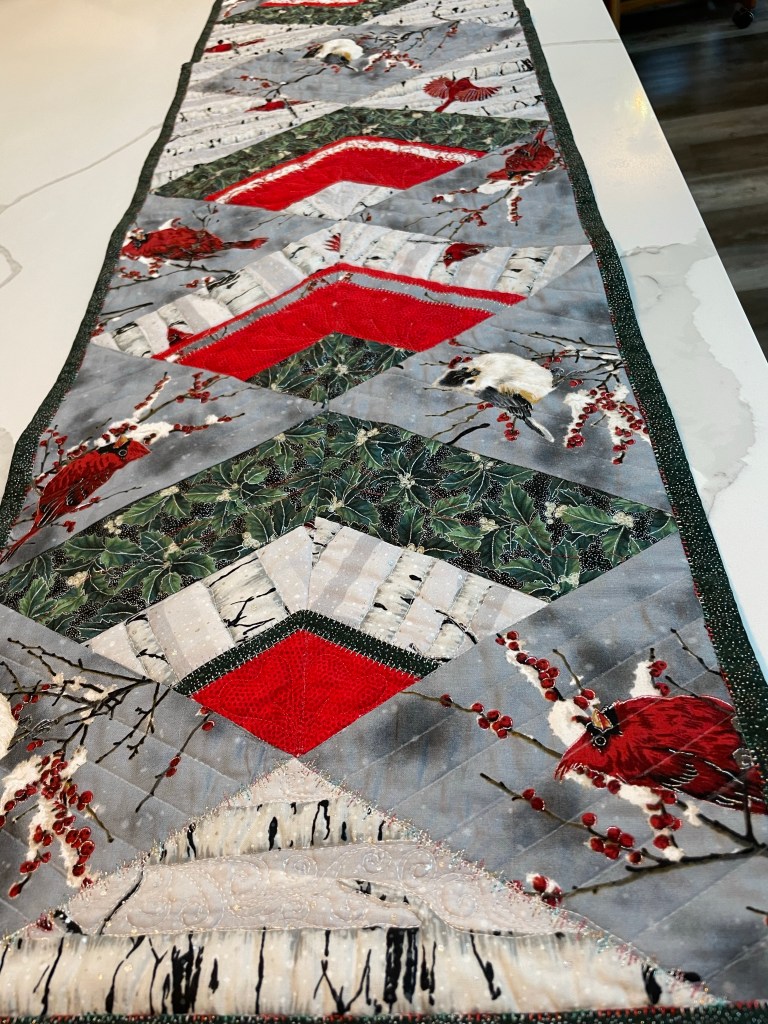 In addition to Christmas stockings, I decided to make up this extra long (62″) table runner for a friend with a penchant for long runners and birds. This was one of my 60 degree ruler projects.