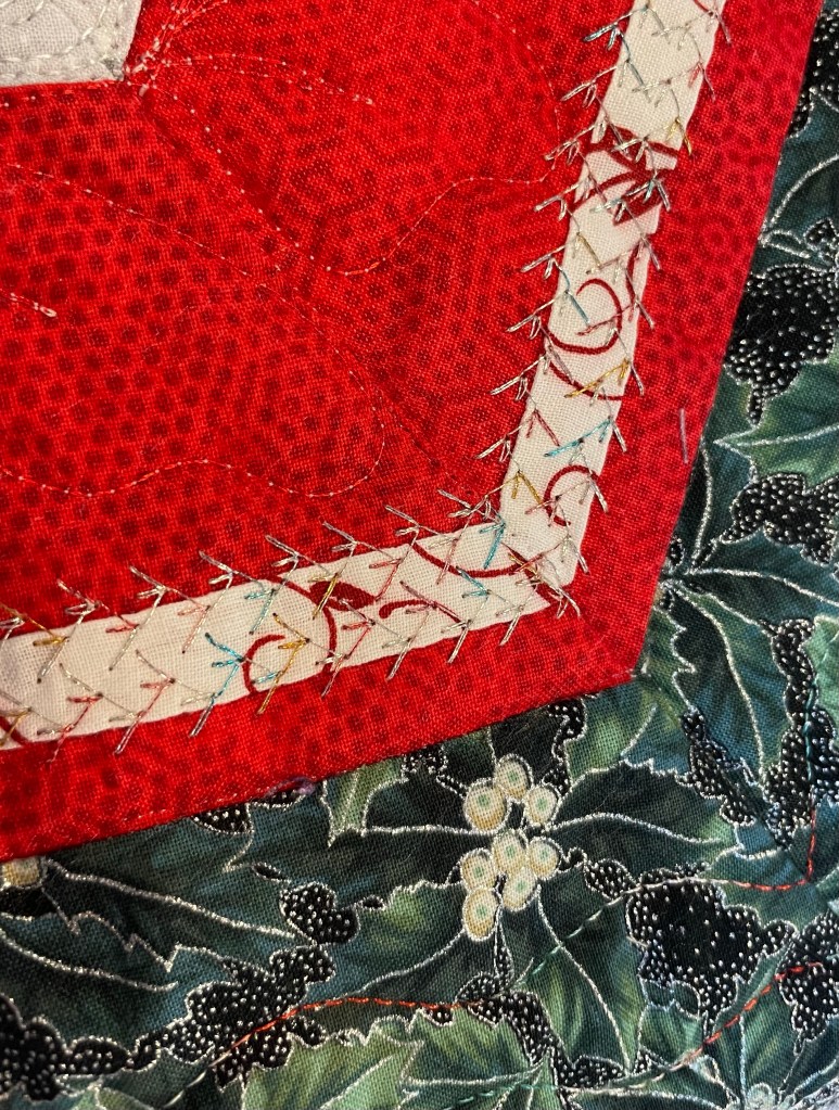 I used bias strips to add texture and interest. Variegated silver on the red and white strip in a deco stitch. Varigated red/white/green on the holly print.