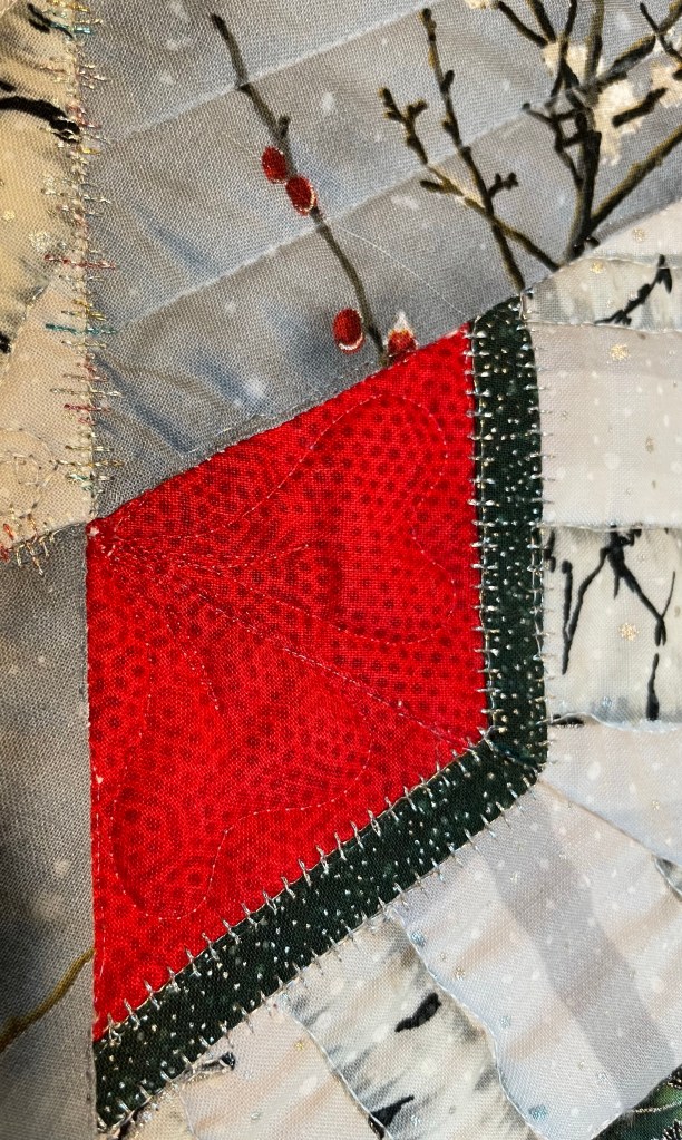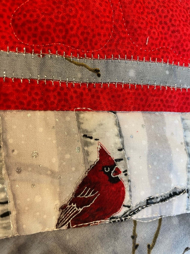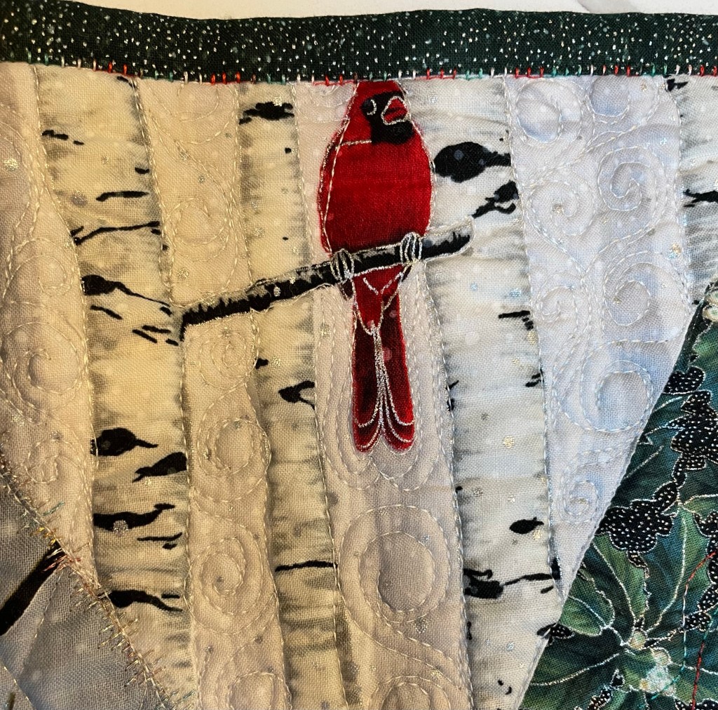 Another cardinal! The binding is stitched in a blanket stitch using a red/white/green variegated thread which is also used in a wave pattern on the dark green holly fabrics. Small swirls help the bird trees to stand out.