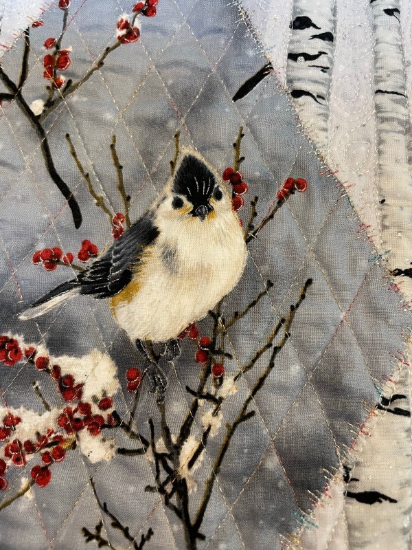 The center 60 degree diamond is the chickadee and is quilted with a silver variegated metallic thread in a cross stitch and framed with the deco stitching in the same thread. I also used Monopoly to stitch around the chickadee.
