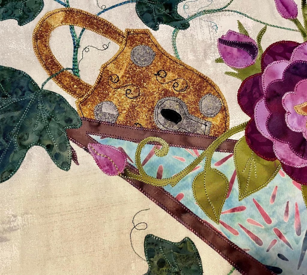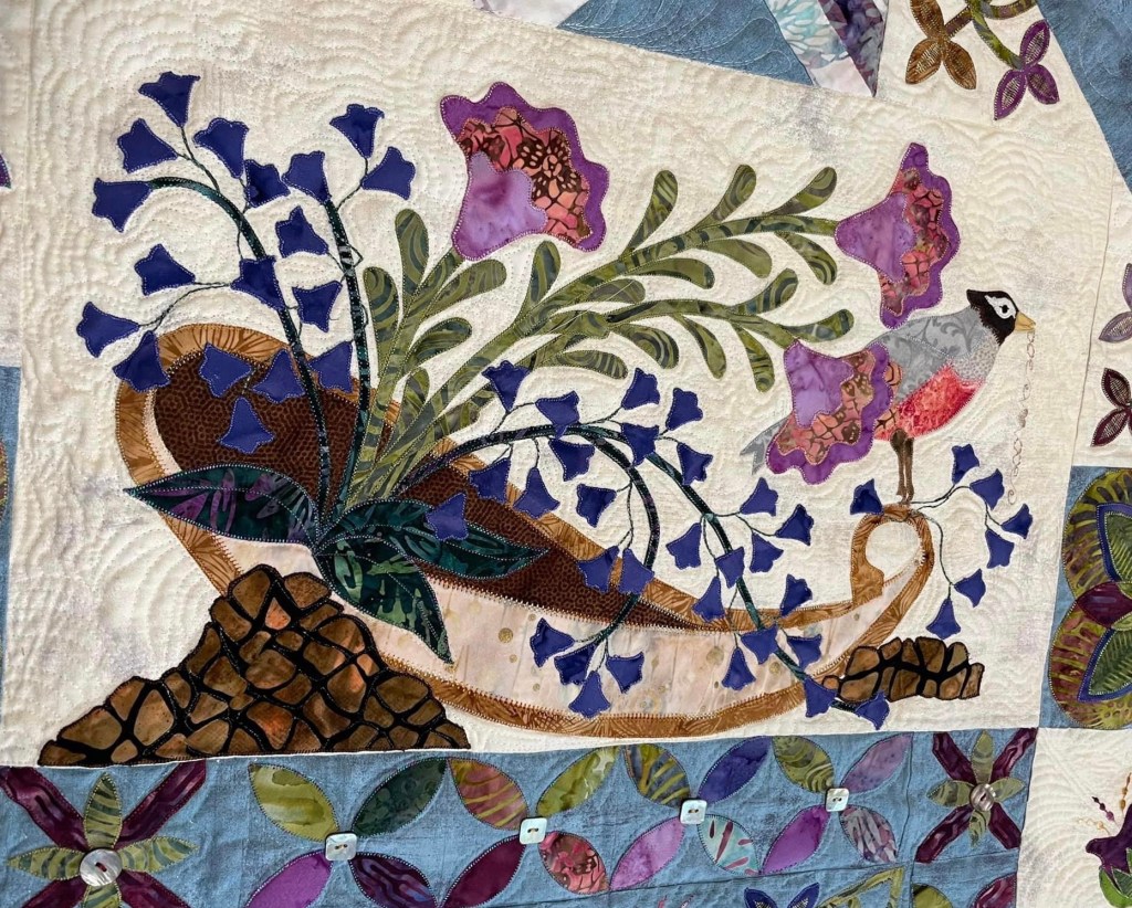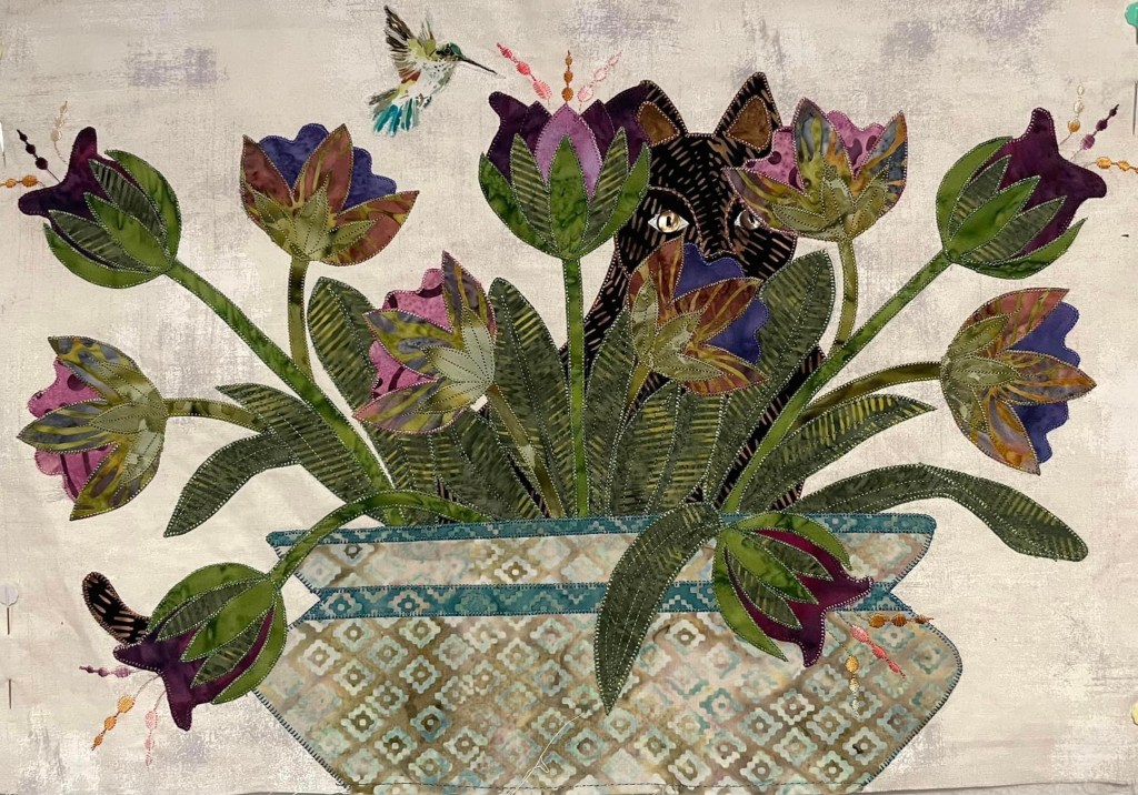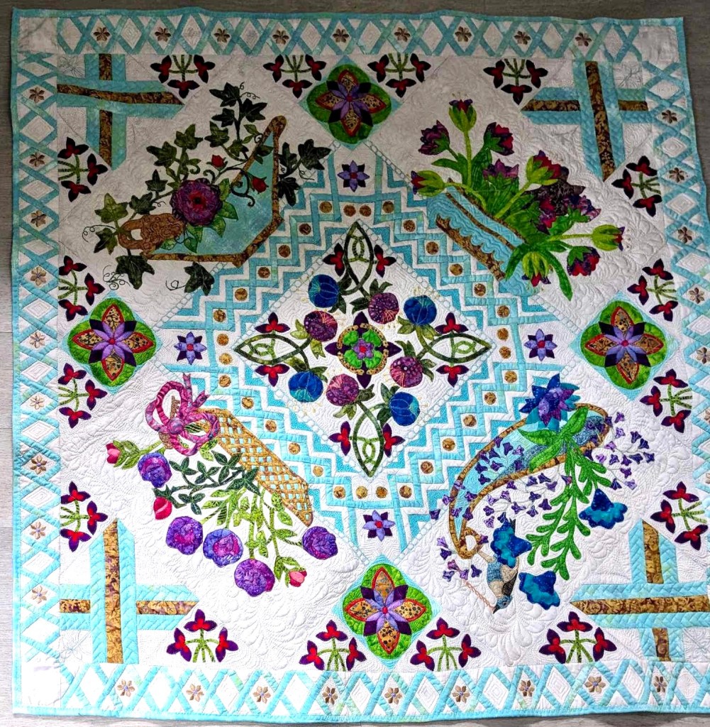 Our final, quilted Secret Gardens.This is our “biggest” and most complex challenge to date. Usually we complete a challenge in the year we select it, but this one needed additional time to complete. What about next year’s challenge? Stay tuned!