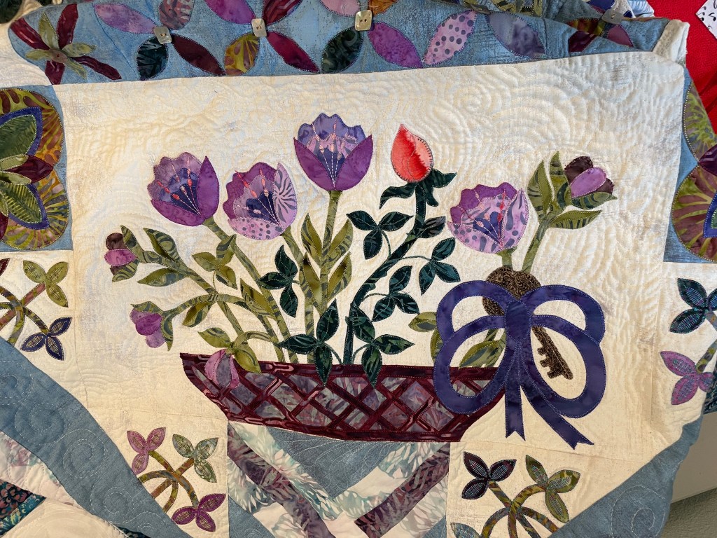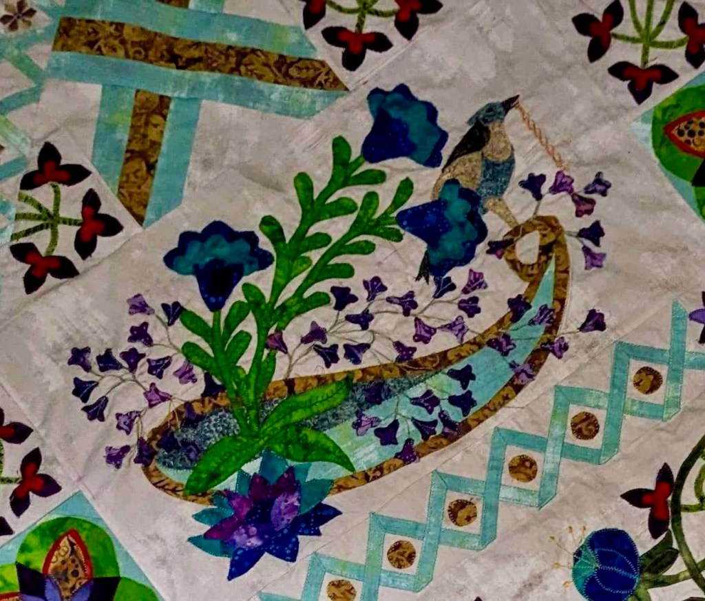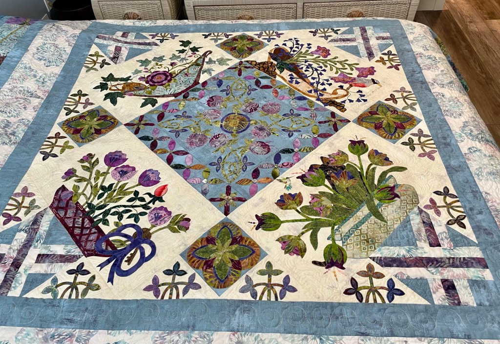 The Secret Garden, pattern by Esther Aliu, took us about a year to complete. This is a beautifully designed and balanced applique project inspired by the book The Secret Garden, by the American author Frances Hodgson Burnett. (And, yes, it was made into movie in 1993!) I detailed the making of this quilt in earlier blogs, but today is just a look at our two challenge projects.