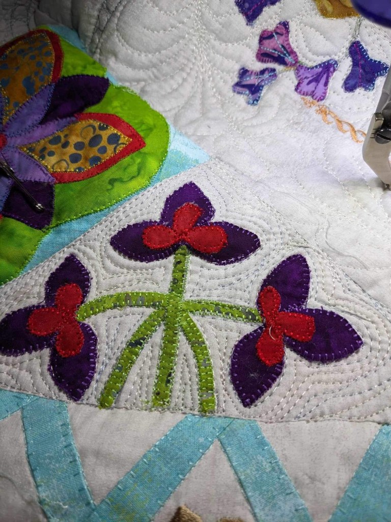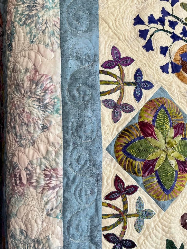 The second round of border allowed me to use up quite a bit of left over layer cake sections and some stash yardage used in the top. I repeated applique elements from the top, including some leftover applique pieces, brought together with a vine traveling through the rectangles.