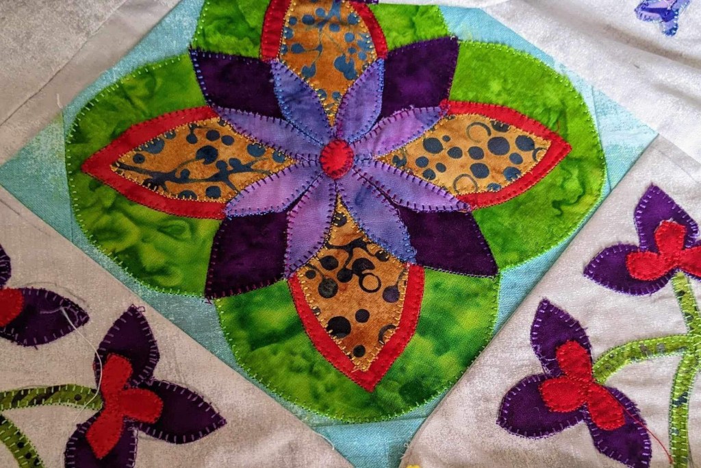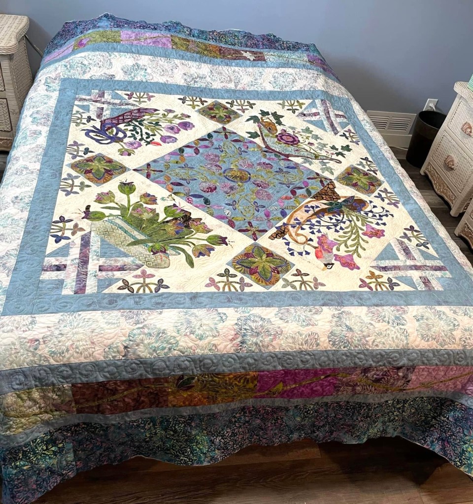 I started mine first, in March of 2022 and completed it in May 2023. Of course, I had my auto immune diagnosis in Jul 2022, so this quilt has been part of that journey as well. Sandra started hers in the fall of 2022 and completed in the summer 2023.