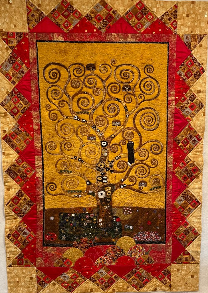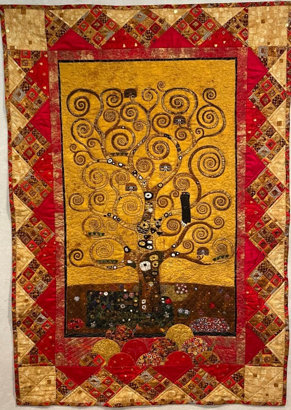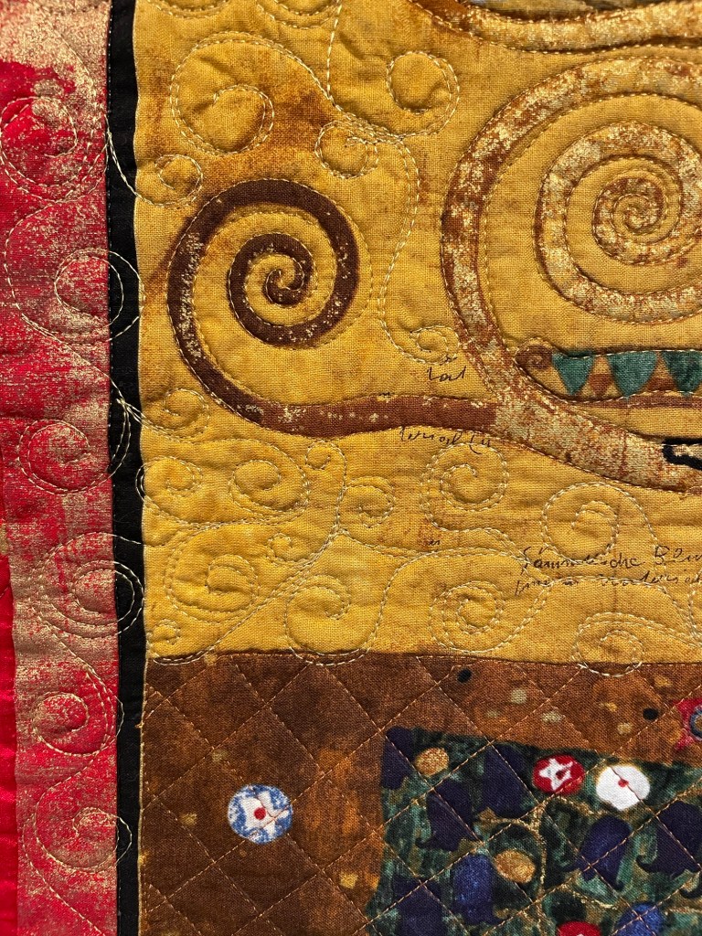 First, as always, the seams were SID with MonoPoly and the tree outlined. I used a curly motif as background, repeating the curly tree branch motif in the panel.