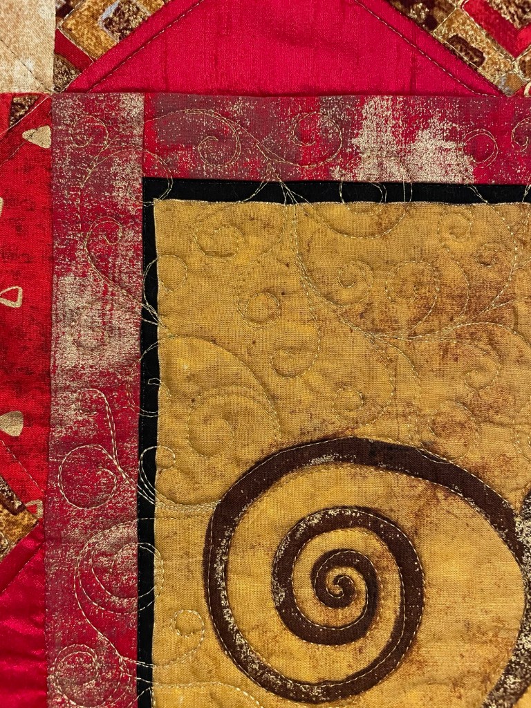 I outlined the diamond shapes in the middle border diamonds with light gold, and then added a simple 1.4″ outline on the triangle border gold and red pieces.