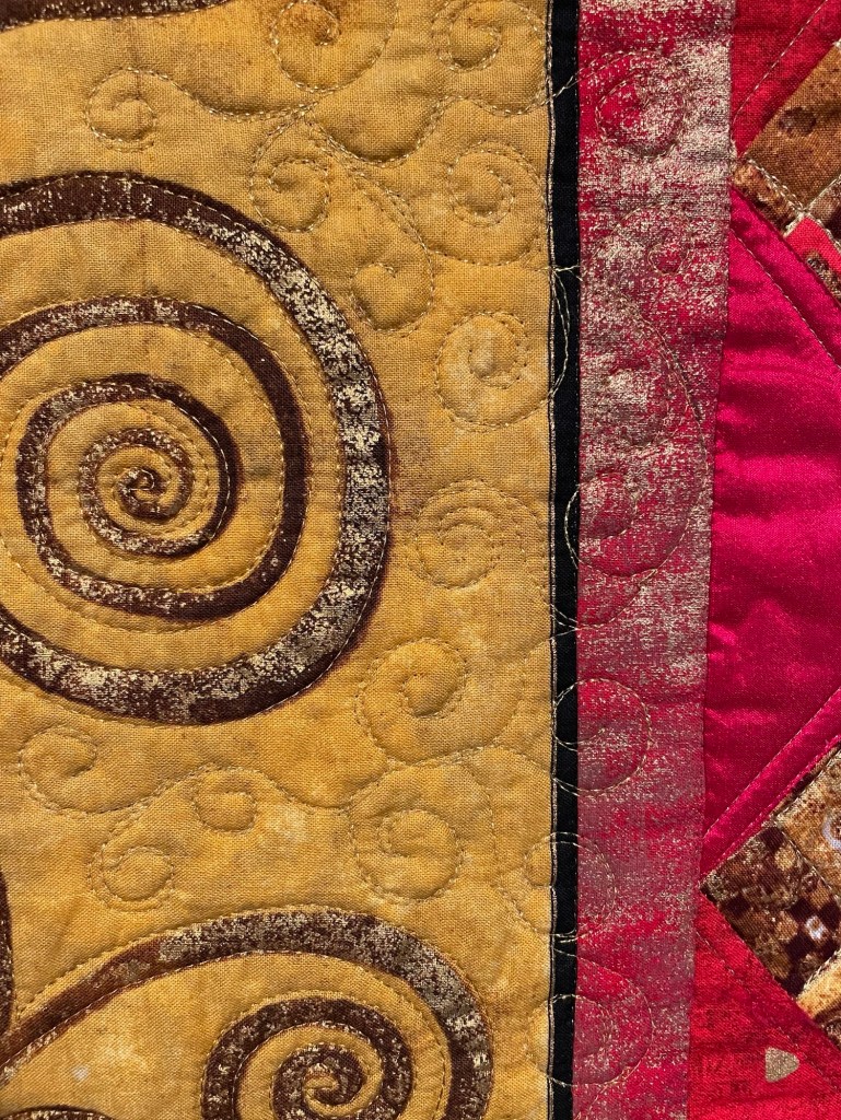 This panel, I confess, was not a favorite when I received it. The gold background on the panel is duller in person. It took some time to figure out how to balance the color. But I was determined to get it pieced and finished.